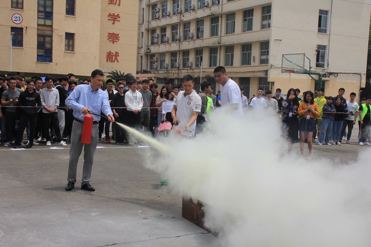 人员确认完毕后,由学院消防专业人员对灭火器的使用和灭火的注意事项进行讲解,蔡华锦书记与辅导员亲自为汽车系的同学们进行灭火器使用做示范。