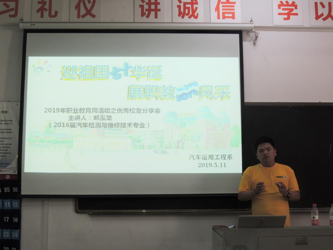 系部分别邀请了2011级汽车服务与维修专业韩彦东,2013级汽车检测与维修技术专业郑泓龙两位往届毕业班校友到校给系部在校学生做相关企业介绍、企业文化、产业发展前景、企业产品研发情况、在校生与企业进行互通对话、增进我系学生对行业企业发展现状和趋势的了解。