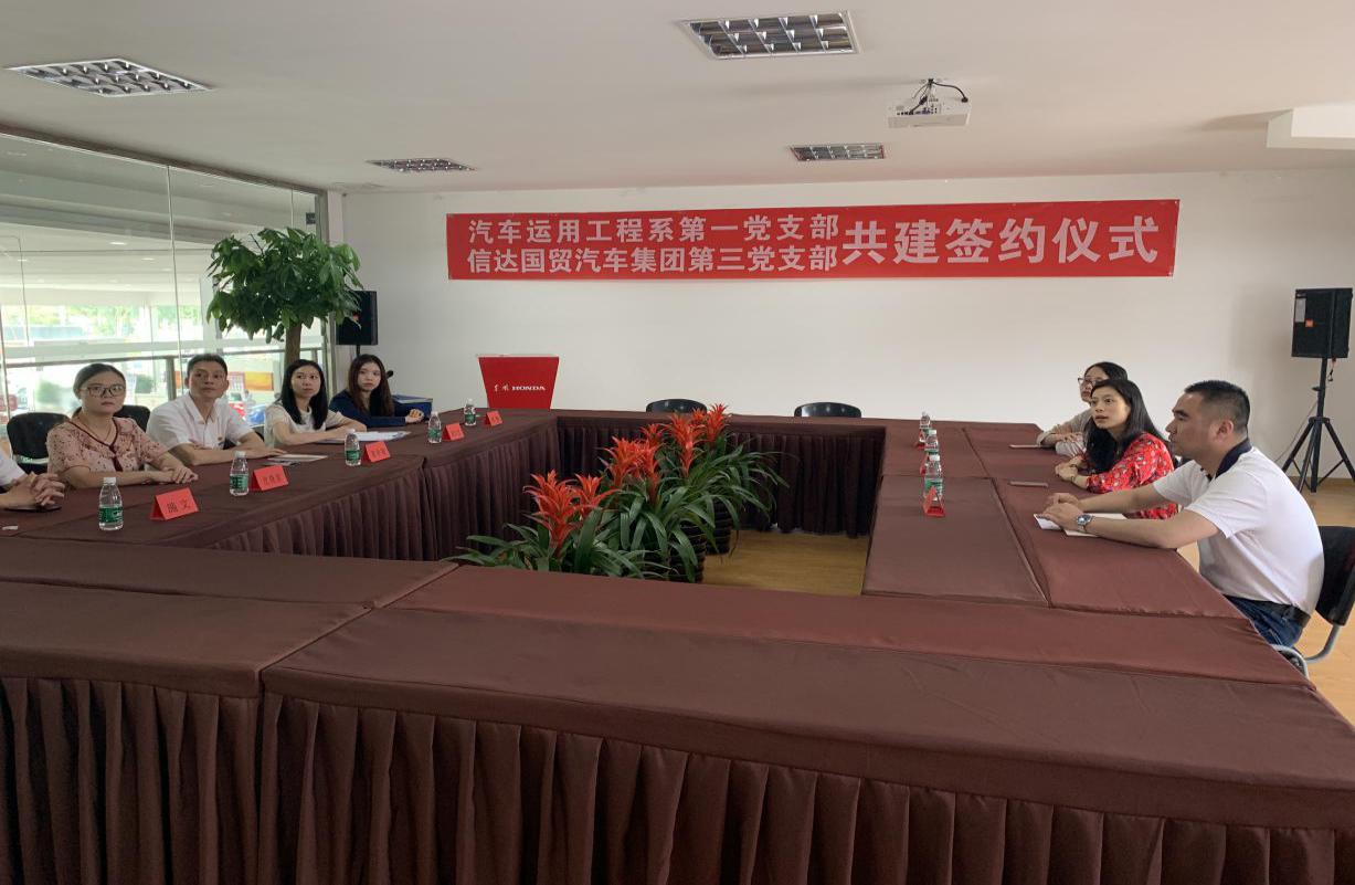 加强党建工作,推动校企基层党组织交流、合作与共同发展,2019年5月13日下午,福建船政交通职业学院汽车运用工程系第一党支部和信达国贸汽车第三党支部在福州华夏汽车城内签订了党支部合作共建协议。