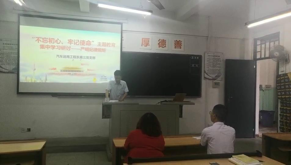 2019年10月18日,汽车系第三党支部全体党员,围绕“不忘初心、牢记使命”主题教育开展第五次专题学习研讨,主题为严明纪律。会上,陈成春老师作重点发言,林绍义、黄丹粟老师作互动发言。陈成春老师“党的政治纪律是党的各级组织和全体党员在思想上、行动上同党的路线方针政策保持一致的行为规范,是党最重要的纪律。严守党的政治纪律,对于巩固党的团结统一,保持党的先进性和纯洁性,增强党的凝聚力和战斗力,保证党的路线方针政策和决策部署的贯彻落实至关重要。