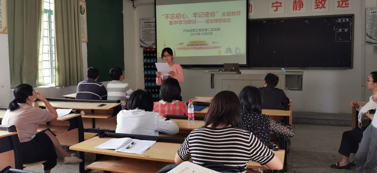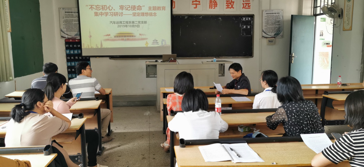 据系总支“不忘初心、牢记使命”主题教育方案和学习研讨计划,2019年10月9日下午汽车运用工程系第二党支部在汽西203教室召开支部会议,分别以“坚定理想信念”为主题,开展了专题研讨学习活动。活动由支部副书记何建主持,汽车系第二党支部全体党员同志参加了活动。