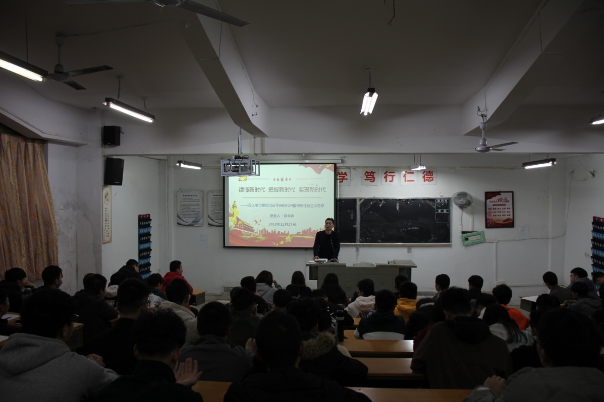 2019年12月27日,汽车运用工程系在一阶教室举办了“形势与政策”课“读懂新时代 、把握新时代、 实现新时代”专题讲座。讲座由汽车运用工程系党总支书记蔡华锦主讲,100名学生参加了讲座。