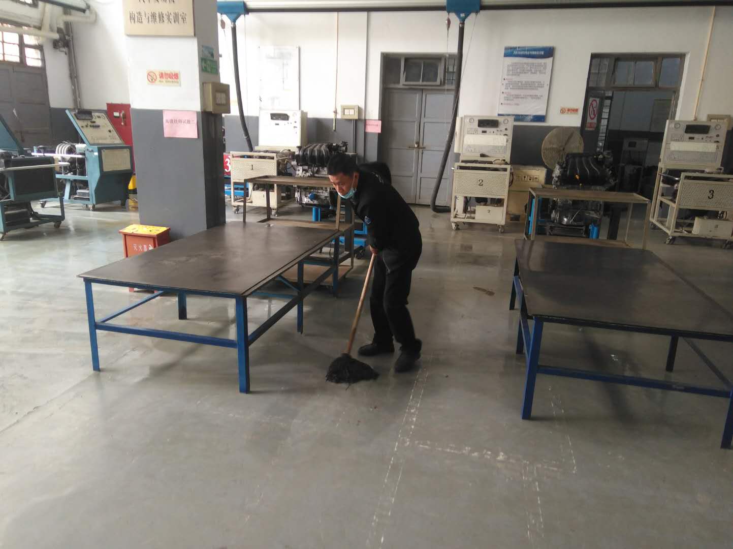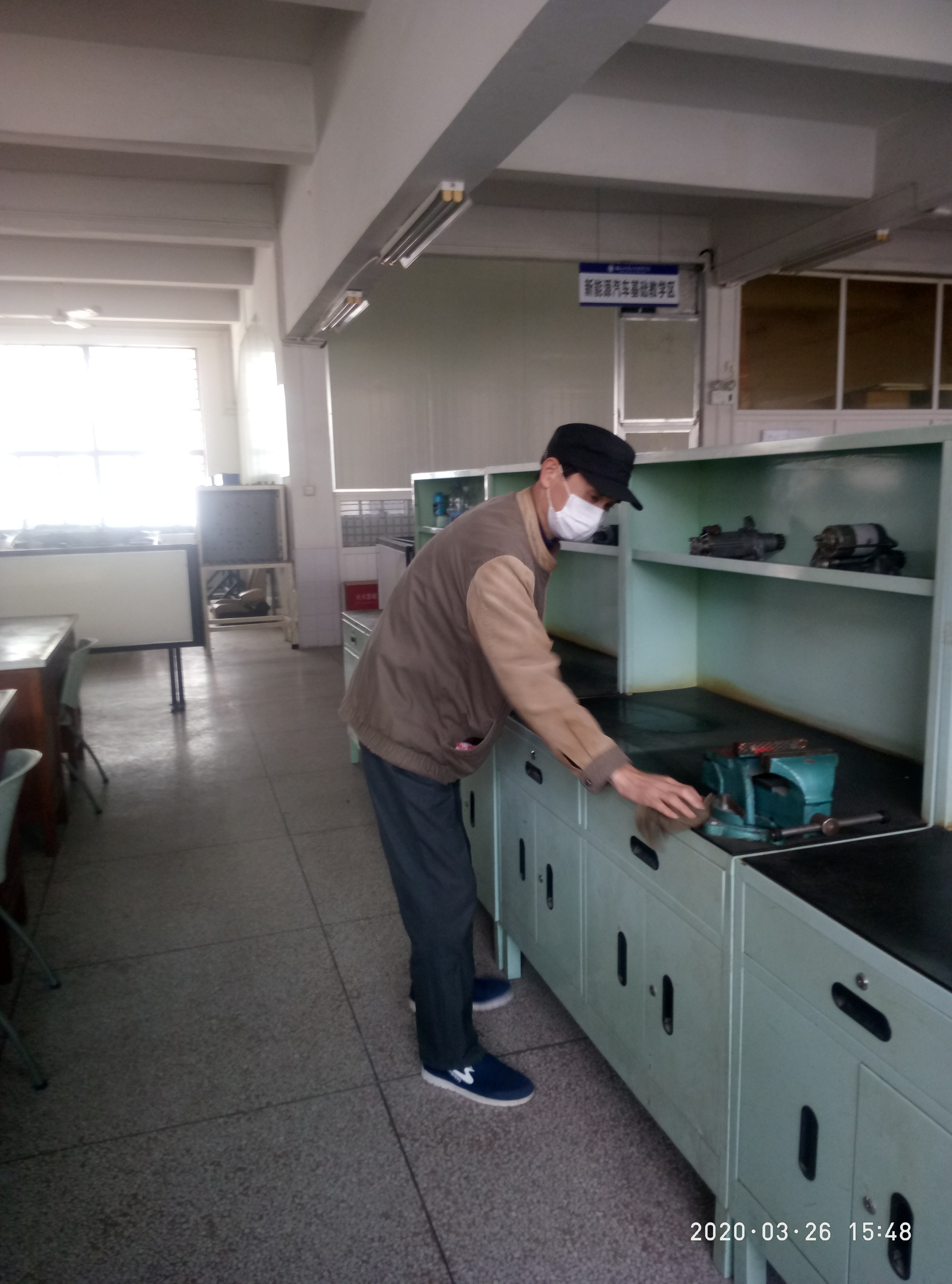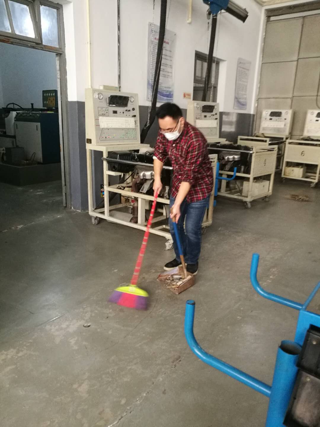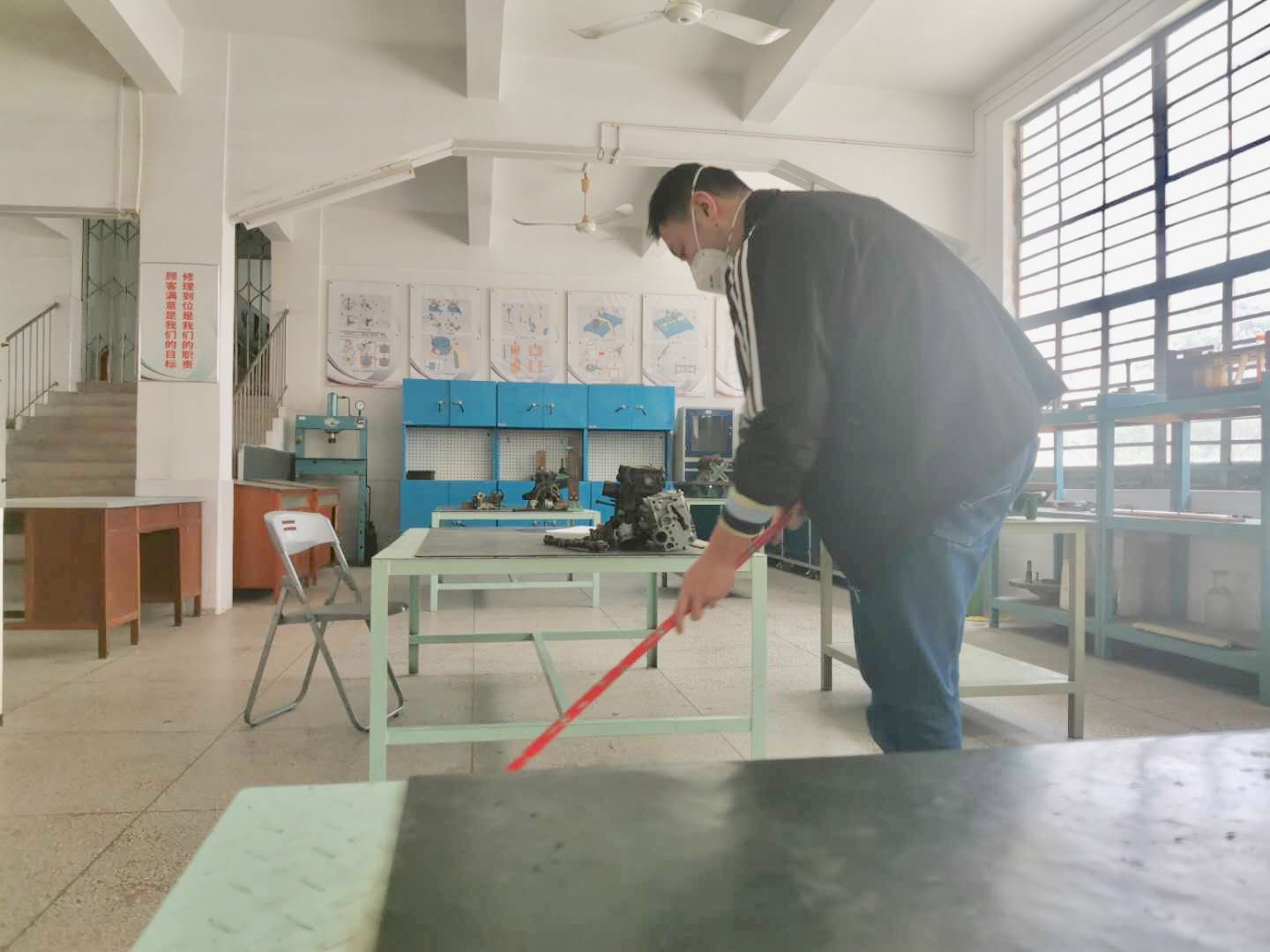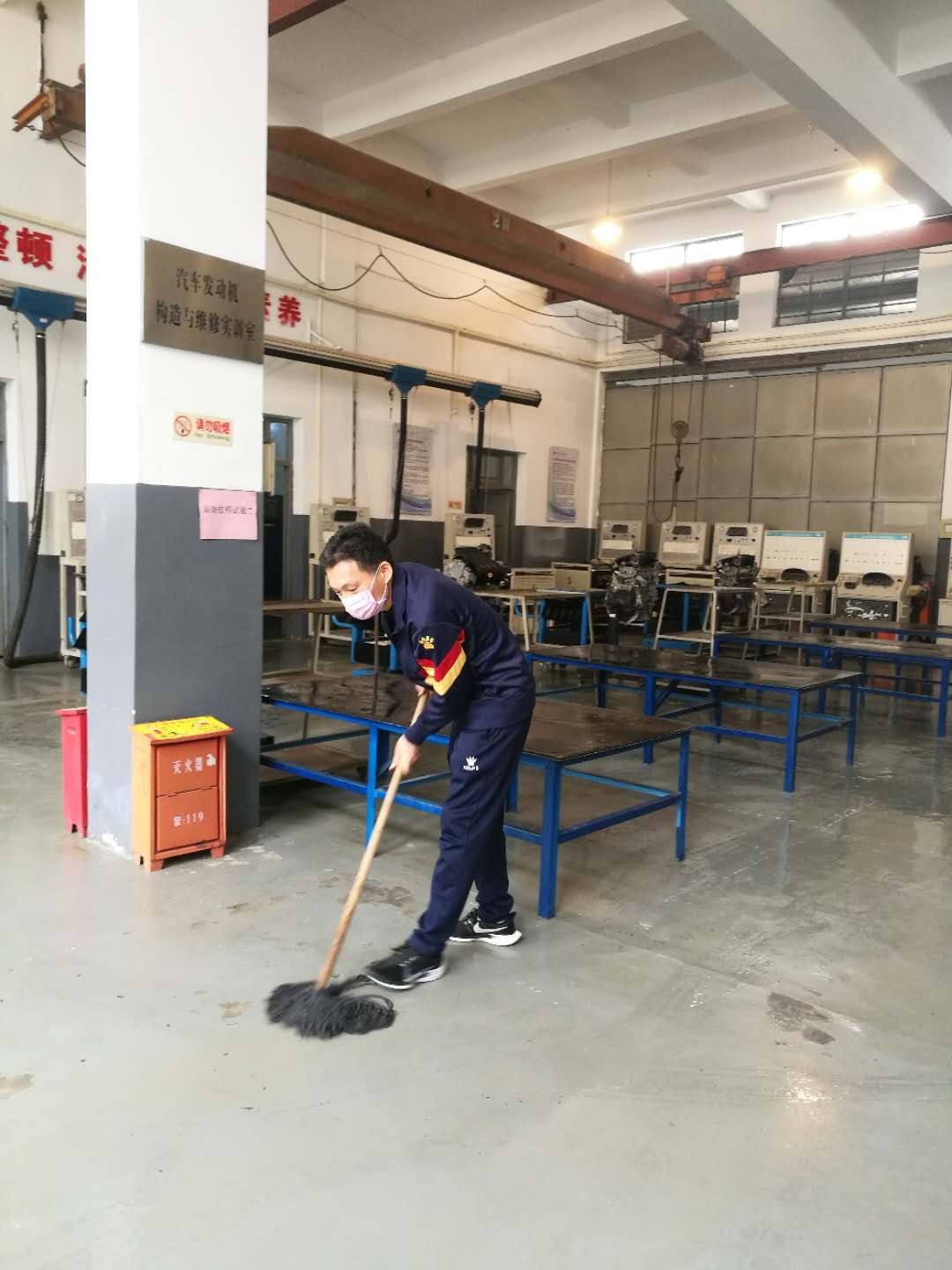 在学校值班的蔡华锦书记以身作则,拿起拖把加入了实训室的抗“疫”工作,与许绍炎老师、黄林火老师、陈建华老师一起认真地打扫了新能源实训室、发动机构造与维修实训室和底盘构造与维修实训室。