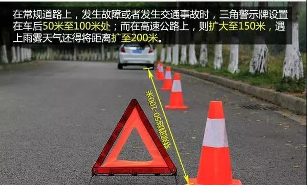 当汽车在行驶当中出现异常,需要紧急靠边停车进行轮胎更换时,须拉好手刹、打开双闪警报灯,一定要按规定摆放三角警示牌,具体操作如下如所示: