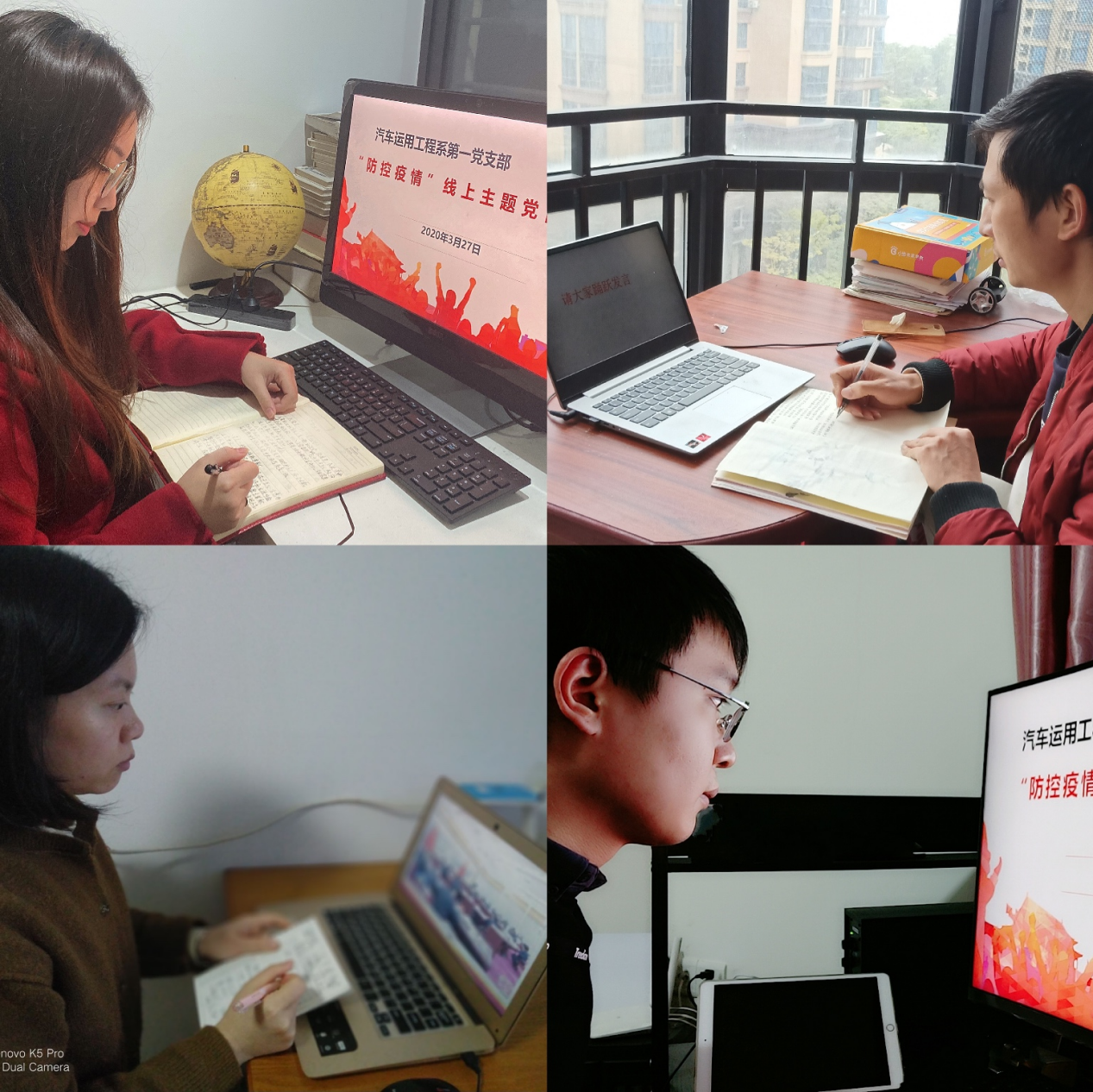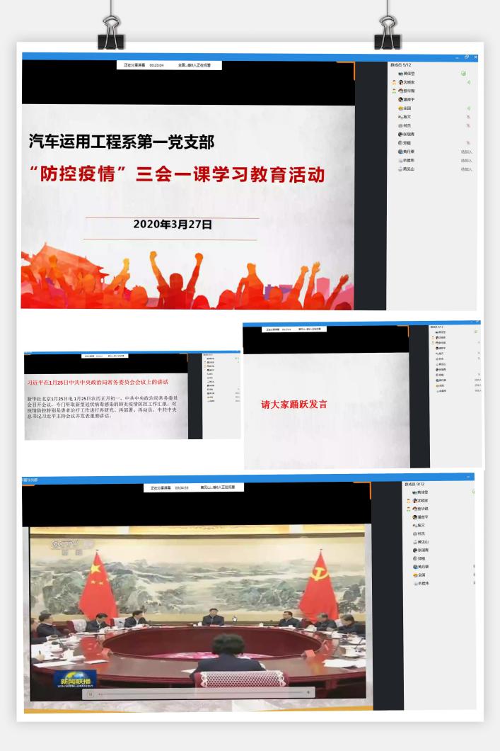 2020年3月27日,根据学院党委工作部的通知要求,汽车运用工程系第一党支部三月份的三会一课和主题党日活动,首次采取线上支部学习的形式开展。第一党支部书记黄佳莹采用QQ同屏播放的形式,组织全体党员老师学习观看中央在防抗疫情工作中的部署讲话视频以及《党委(党组)落实全面从严治党主体责任规定》内容,进一步深入学习领会习近平总书记在中共中央政治局常务委员会上关于疫情防控工作的重要讲话精神。