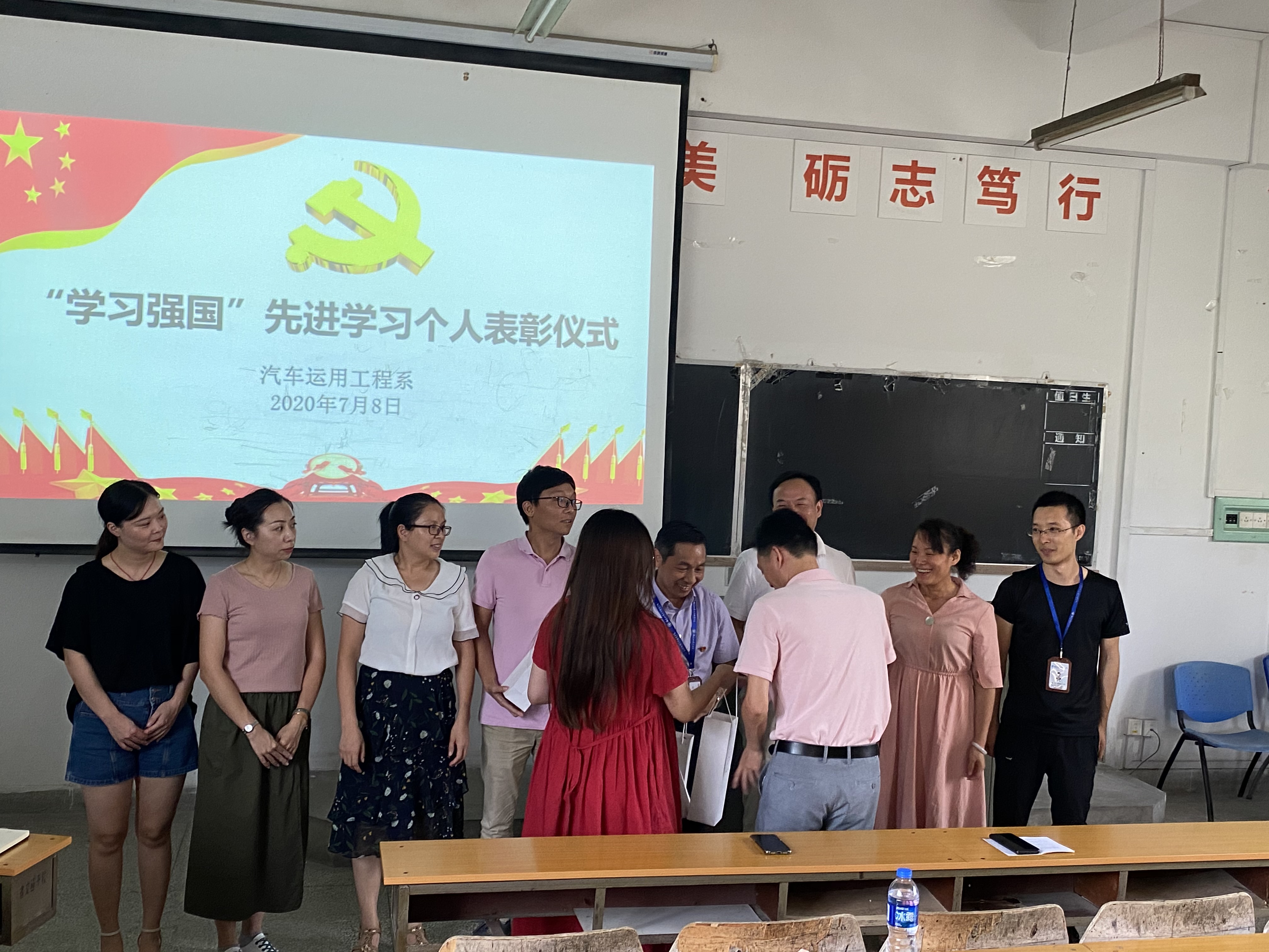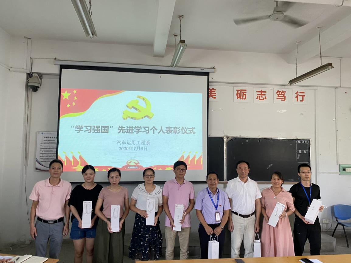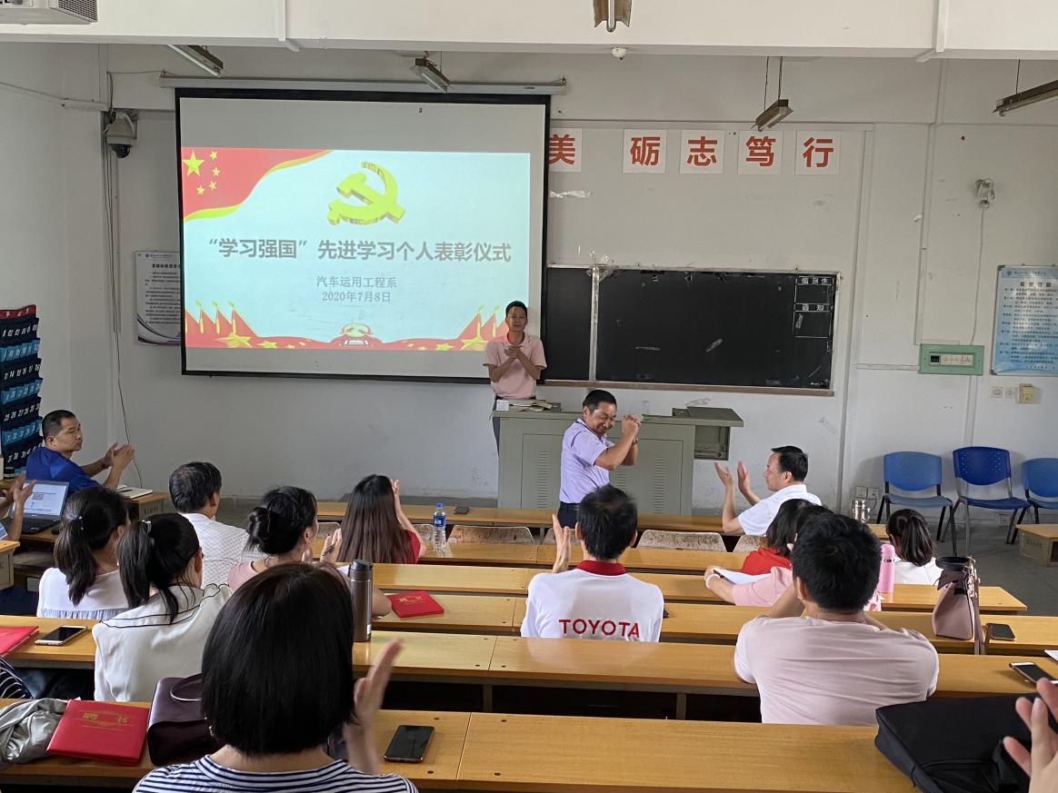 2020年7月8日汽车系党总支在第二阶梯教室召开全系教职工大会,对谢哲伟等8名同志学习强国“学习先进个人”进行表彰。