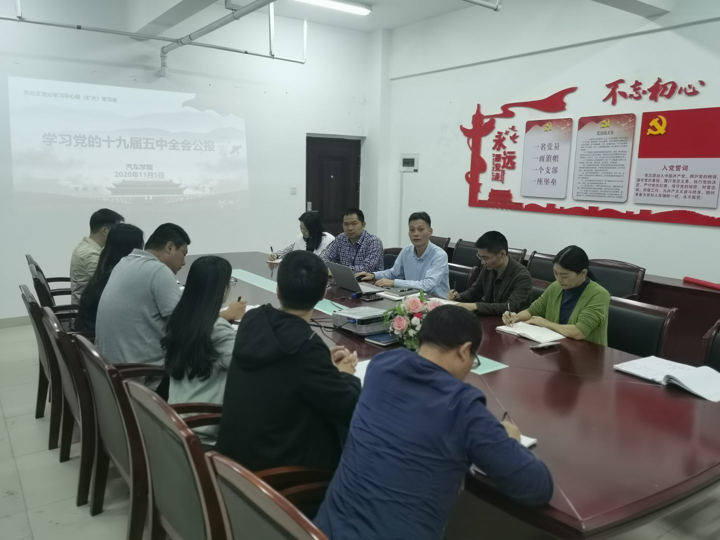 11月5日上午,汽车学院党总支理论学习中心组在图书馆九楼会议室召开学习会,传达学习党的十九届五中全会精神。学院理论学习中心组成员、各党支部书记、全体辅导员参加会议。会议由党总支书记蔡华锦主持。
