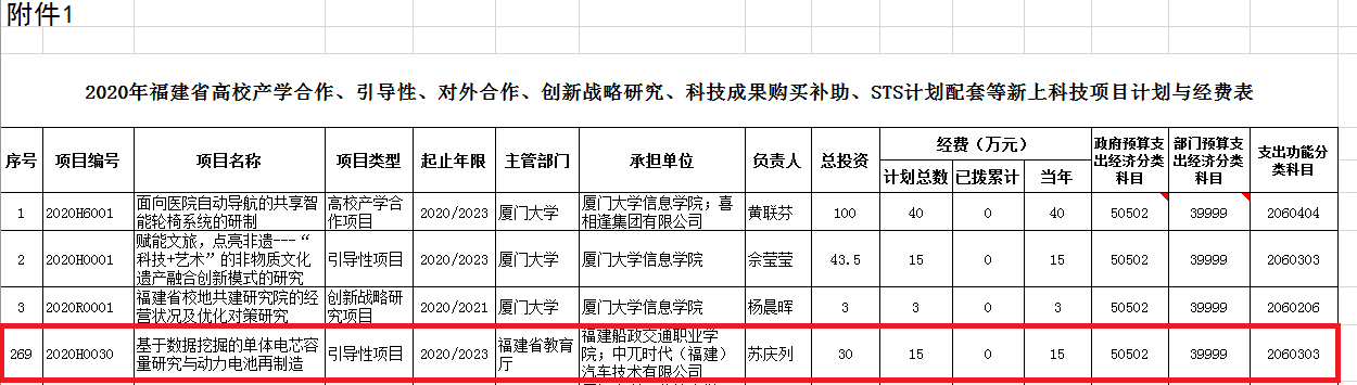 11月17日,福建省财政厅、福建省科学技术厅公布2020年度科技计划项目评审结果,我院汽车科技创新服务团队负责人苏庆列副教授主持的《基于数据挖掘的单体电芯容量研究与动力电池再制造》项目,喜获福建省科技厅引导性重点项目资助,经费15万元。