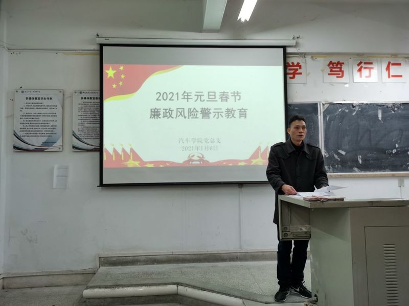 为进一步严明纪律、正风肃纪,落实廉洁自律和厉行节约有关规定,继续深化巩固落实中央八项规定精神,杜绝“四风”,确保风清气正、廉洁过节,2021年1月6日,汽车学院召开2021年元旦春节前教职工廉政警示教育大会,会议由总支书记蔡华锦同志主持,学校纪委办公室副主任林栩同志与汽车学院全体党政干部、教职工参加了会议。