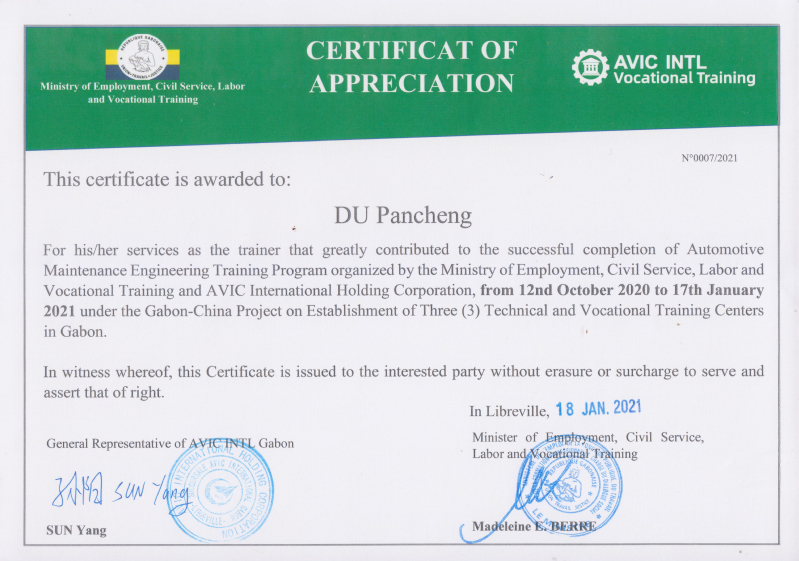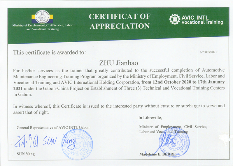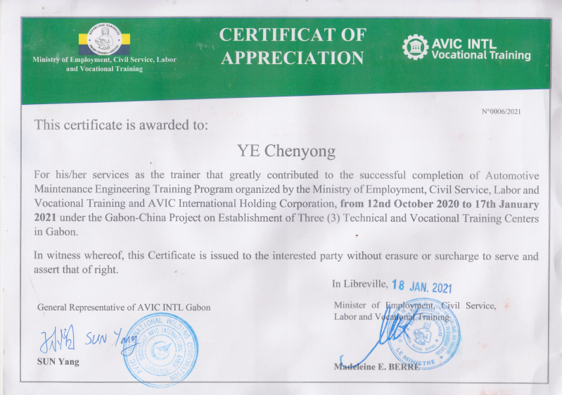 在中航国际、3位教师和译员们的大力合作和支持下,培训组通过管理创新克服了培训初期的各种困难,最终在防疫零感染的前提下,顺利完成了为期14周的汽修专业师资培训。学员考试平均分数87.89,高于讲师制定的85分标准线。加蓬国家、学员和中航国际对三位教师的培训水平给予很高的评价。加蓬劳工部专门分别对三位教师颁发了嘉奖状。