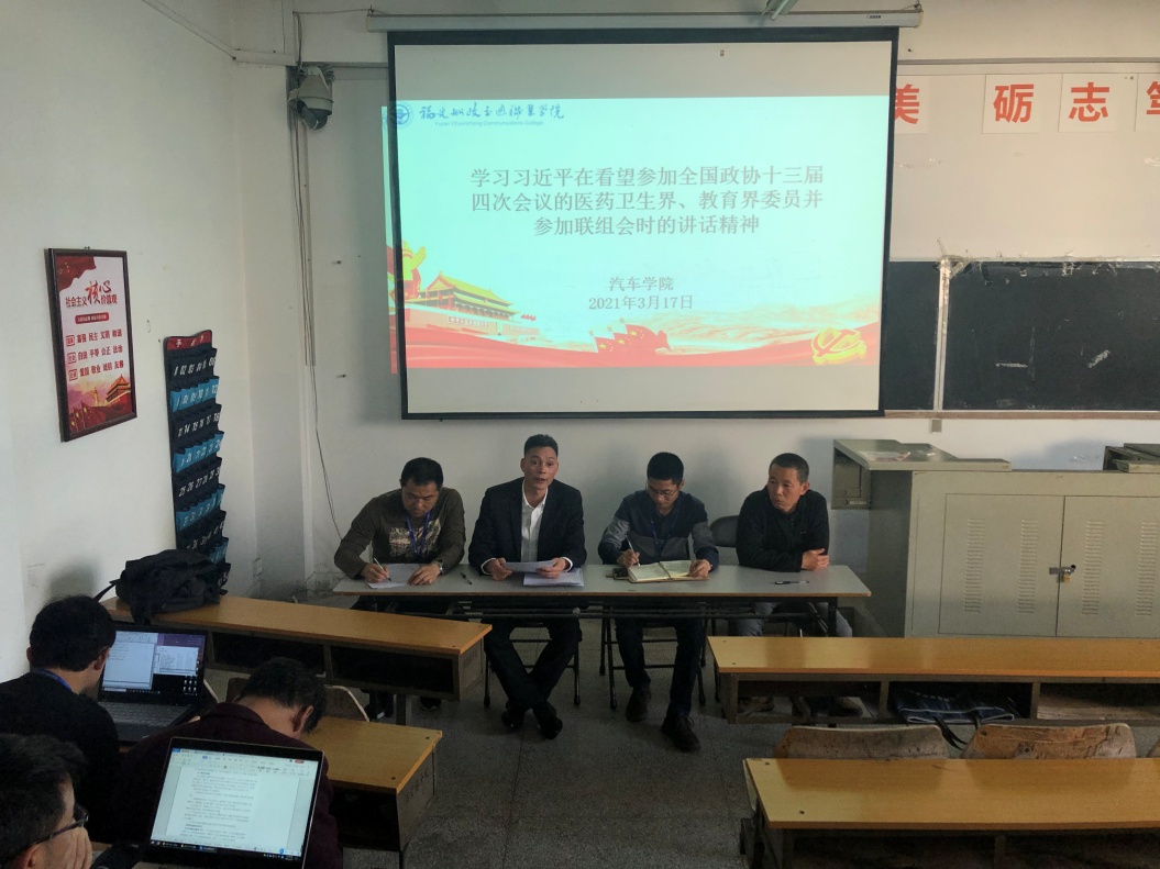 2021年3月17日,汽车学院组织全体教职工学习“习近平在看望参加全国政协十三届四次会议的医药卫生界、教育界委员并参加联组会时的讲话精神”。