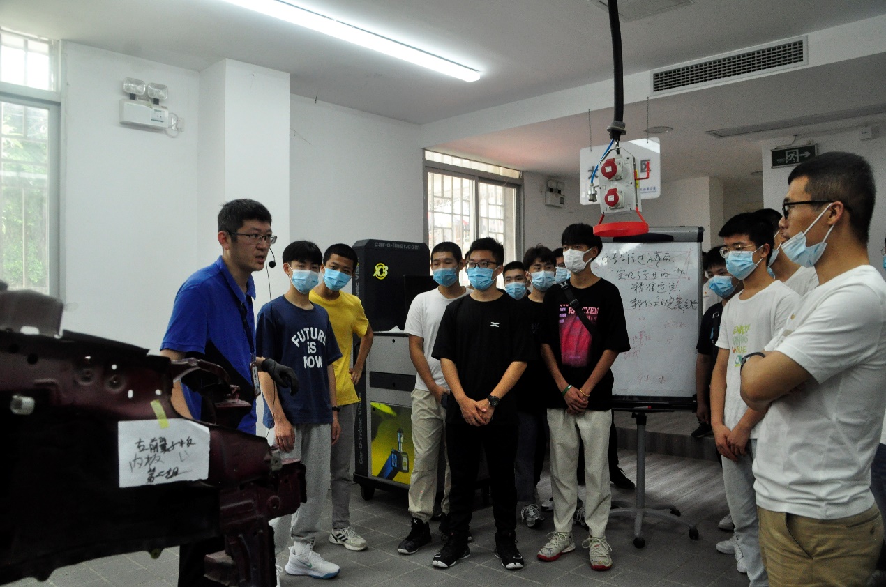 上午9点半,由福建理工学校魏日成老师和伍英贤老师带领的20名中职学生,乘坐大巴来到南区的奥迪实训中心。汽车学院的黄知秋老师带领理工学校的老师和同学们参观了一楼的奥迪机电实训室和二楼的钣金实训室。