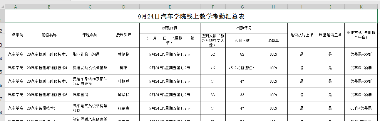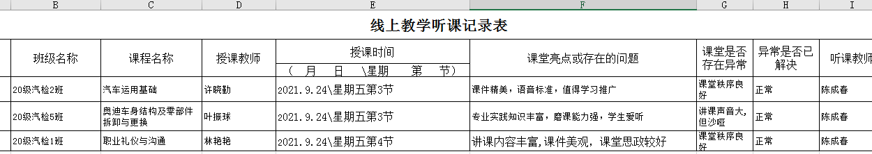 受疫情影响,2021年9月14日开始,学院全面转为在教室上线上教学课,汽车学院利用QQ群、优慕课等互联网资源,二级督导实行线上巡课;每日安排辅导员、班主任或教研室主任深入教室和宿舍进行线下督学,并利用监控进行实时督导。学院每日线上线下巡课后,及时收集教师的巡课记录单,做到及时发现问题、反馈问题和解决问题,做到有台账可依。