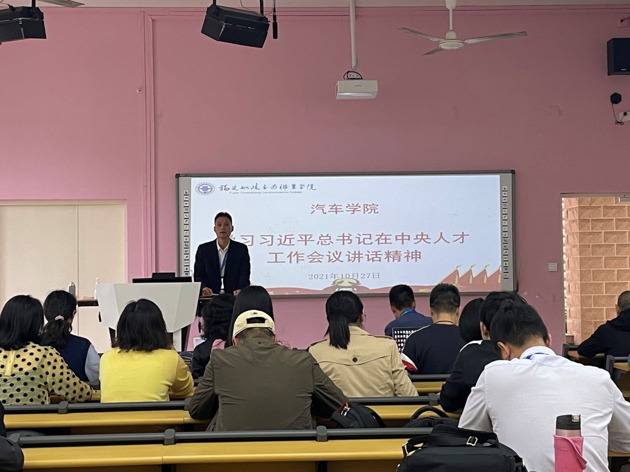 10月27日下午,汽车学院党总支召开全院教职工大会,学习贯彻习近平总书记在中央人才工作会议上重要讲话精神,全体教职工参加会议,学院党总支书记蔡华锦主持会议并讲话。