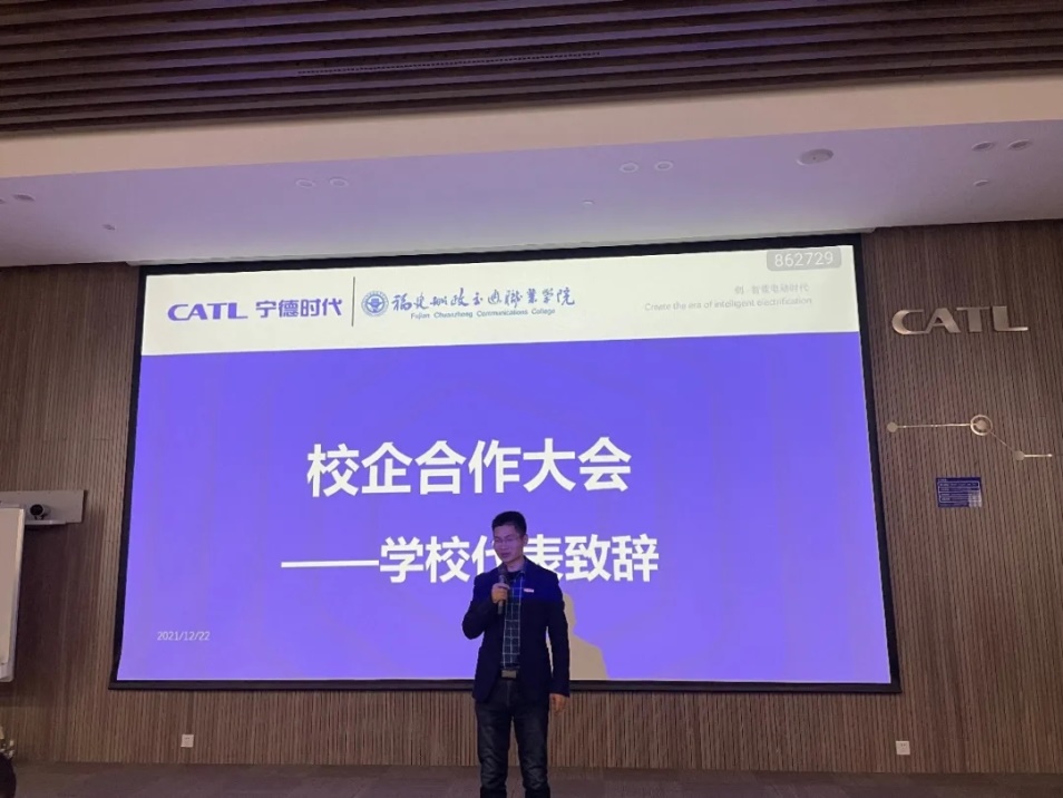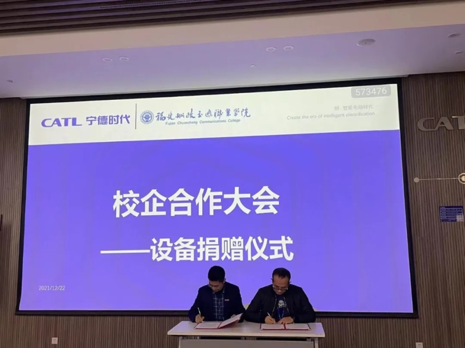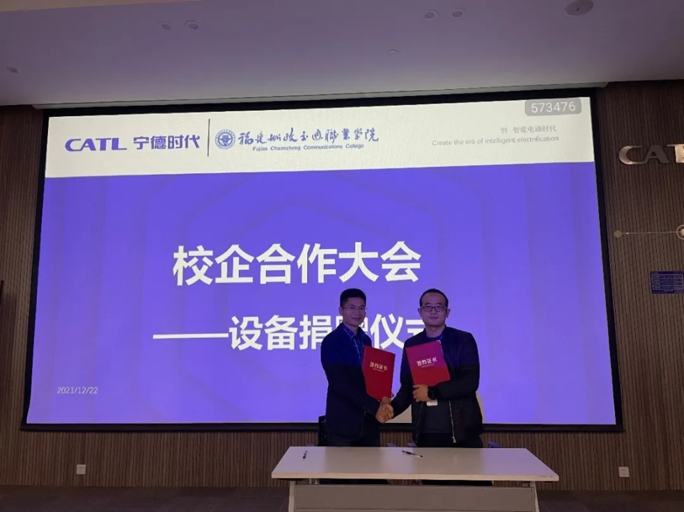 苏庆列副院长代表我们学院与宁德时代代表曹彬经理进行了宁德时代捐赠设备的签约仪式,宁德时代将会捐赠一台价值100万元的模切机给我们学院。该设备投入教学后,将会完善我们学院的实训室条件,使面向宁德时代的订单班学生可以提前学习并操作企业的生产设备,毕业后实现与企业无缝对接。