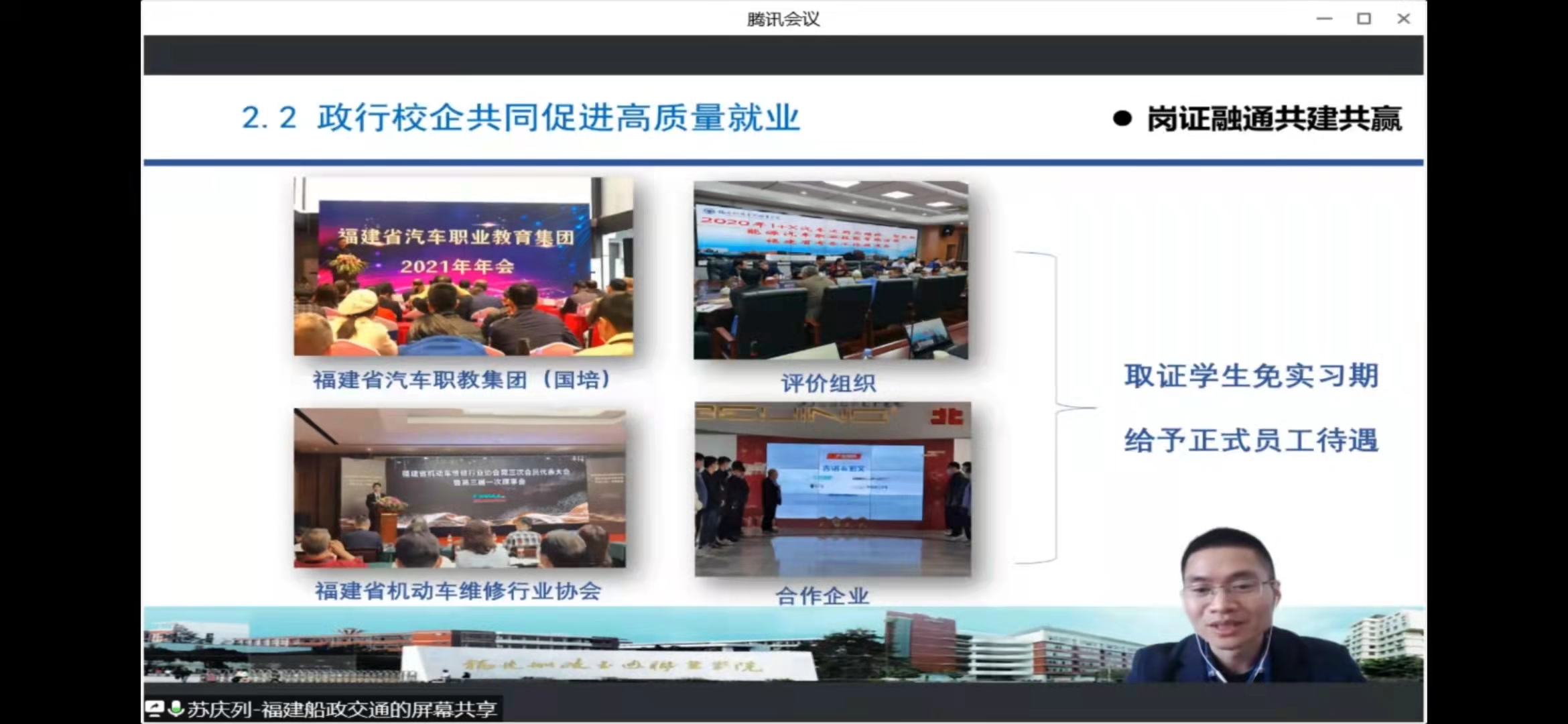 汽车学院苏庆列院长受邀在会上作“岗证融通基地建设设想”的报告,分享了汽车学院对接1+X职业证书制度,将岗证融通融入教学,研修人才培养方案、重构课程教学标准、实施模块化教学等教学改革,从校企合作共建岗证融通实训基地、政行校企共同促进高质量就业、岗证融通基地助力1+X证书推广三个维度提出了岗证融通共建共赢的设想,报告获得与会代表的热烈好评。