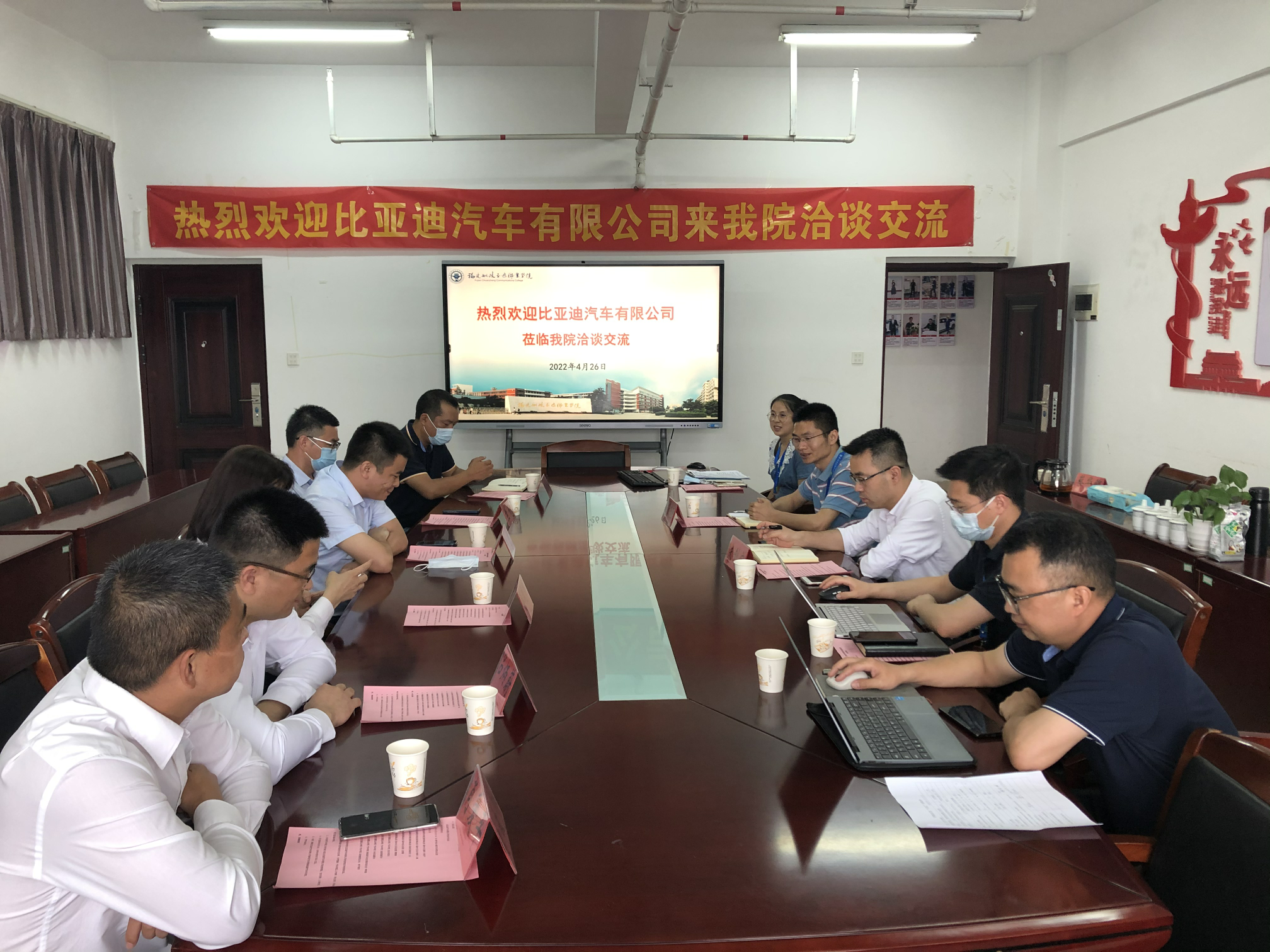 4月26日,比亚迪汽车有限公司(福州)肖爱平一行来我院交流校企合作事宜。汽车学院苏庆列院长、朱剑宝副院长、新能源汽车技术教研室主任李智强及其他骨干教师参与了交流会。