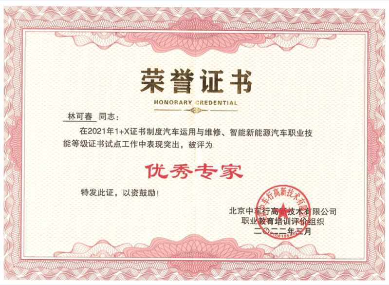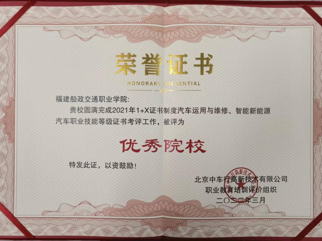 2021年,汽车学院顺利完成了汽车运用与维修“1+X”证书考点建设和学生考证工作,在培训考评工作过程中,由于表现突出,被教育部评价组织北京中车行高新技术有限公司授予考评工作“优秀院校”称号,汽车学院苏庆列院长、林可春副院长被评为“优秀专家”。