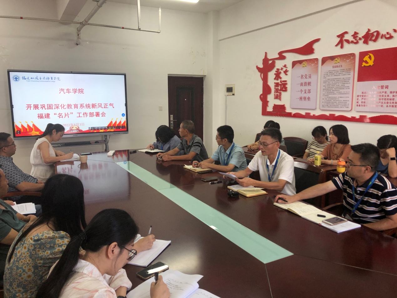 为进一步巩固深化“坚守立德树人初心,办好人民满意教育”教育系统新风正气福建“名片”,汽车学院于2022年8月3日在图书馆9楼会议室召开开展巩固深化教育系统新风正气福建“名片”工作部署会,全体教职工参加会议,会议由蔡华锦书记主持。