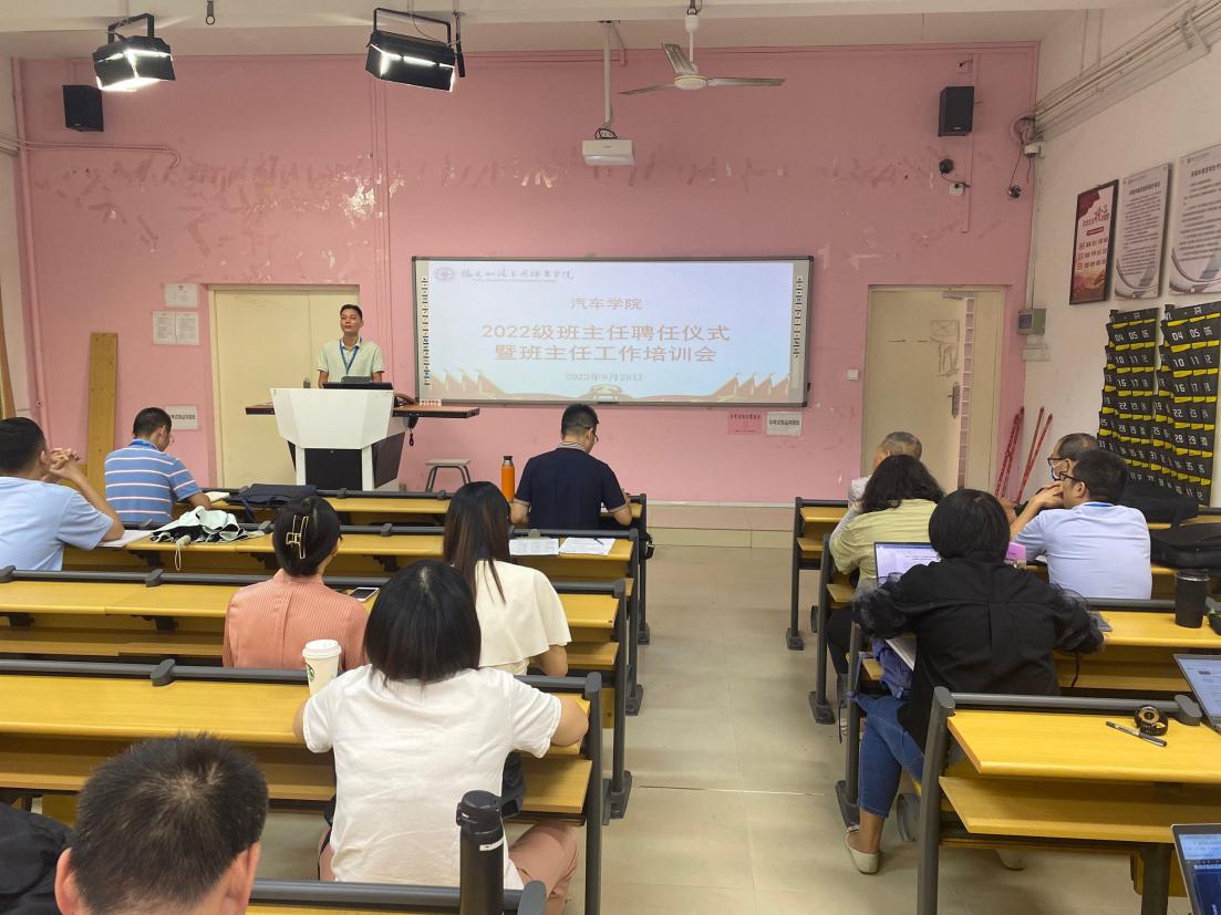 为强化班主任队伍建设,进一步贯彻落实教育部《关于加强高等学校辅导员班主任队伍建设的意见》,深化落实立德树人根本任务,完善“三全育人”工作格局,提升班主任工作实效,2022年9月28日下午,汽车学院在2#1-3教室开展2022级班主任聘任仪式暨班主任工作培训会,汽车学院党政领导班子成员、全体辅导员、班主任参加会议。