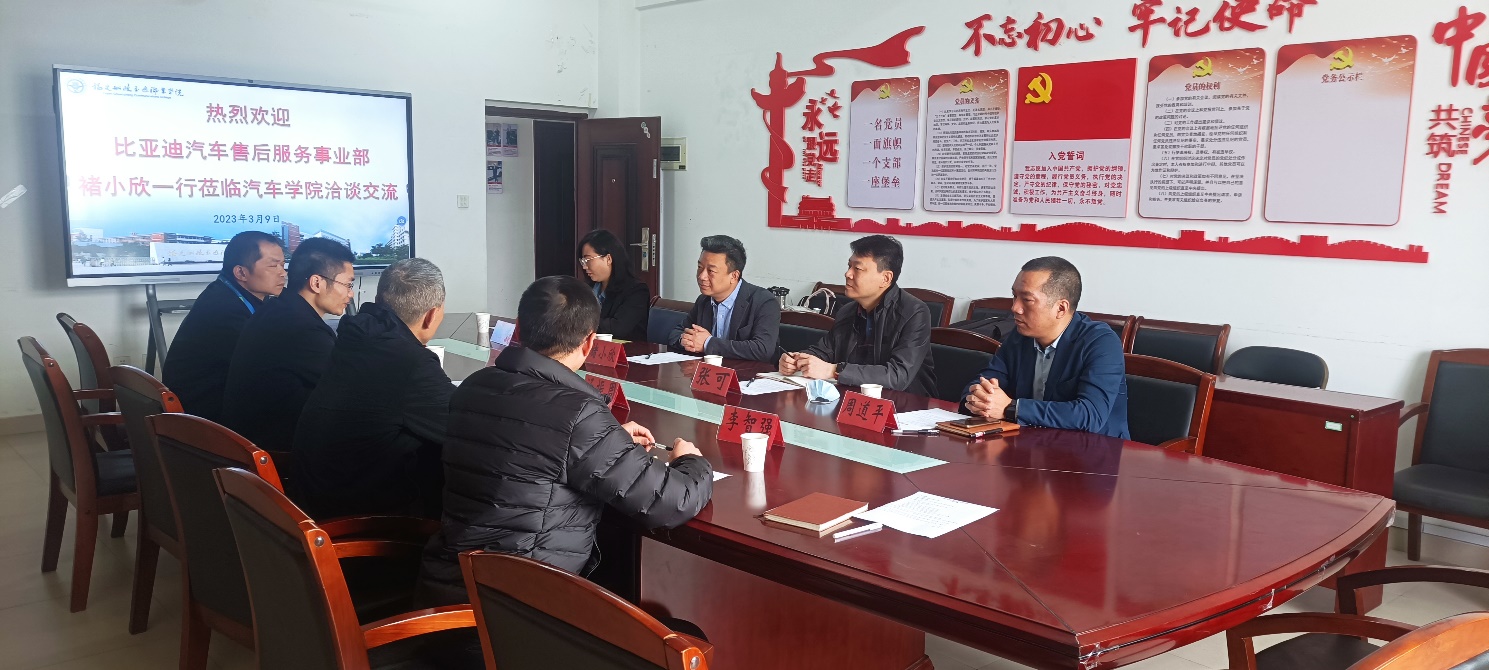 为深入贯彻落实党的二十大精神,深化产教融合校企合作,2023年3月9日上午9:30,汽车学院在图书馆9楼会议室召开了比亚迪校企合作洽谈交流会。比亚迪汽车售后服务事业部培训部经理褚小欣,比亚迪新能源汽车精诚英才培育项目组中车云商(北京)信息技术有限公司市场总监张可、市场经理魏芳,汽车学院苏庆列院长等学院领导和专业骨干教师参加座谈。
