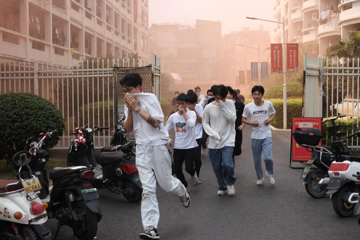 随着警报声响起,汽车学院全体师生听从广播系统的指引,迅速组织同学们拿毛巾浸湿,捂住口鼻,即刻快速远离着火点,弯腰低头,有序跟随指挥人员按疏散路线快速撤离至安全地带。整个疏散过程急而不乱、稳定有序,顺利地完成此次消防安全疏散逃生演练活动。
