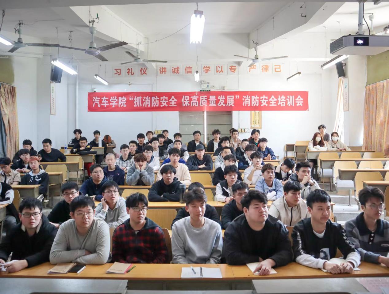 “消防演练”活动前夕汽车学院召开消防安全演练培训会。培训会上,指导老师结合近年来的火灾案例,分析火灾发生的起因以及火灾造成的财产损失和人身安全危害,同时系统地讲解了日常生活中应该如何做好隐患排查,预防火灾的发生,以及如何正确逃生等消防安全知识。