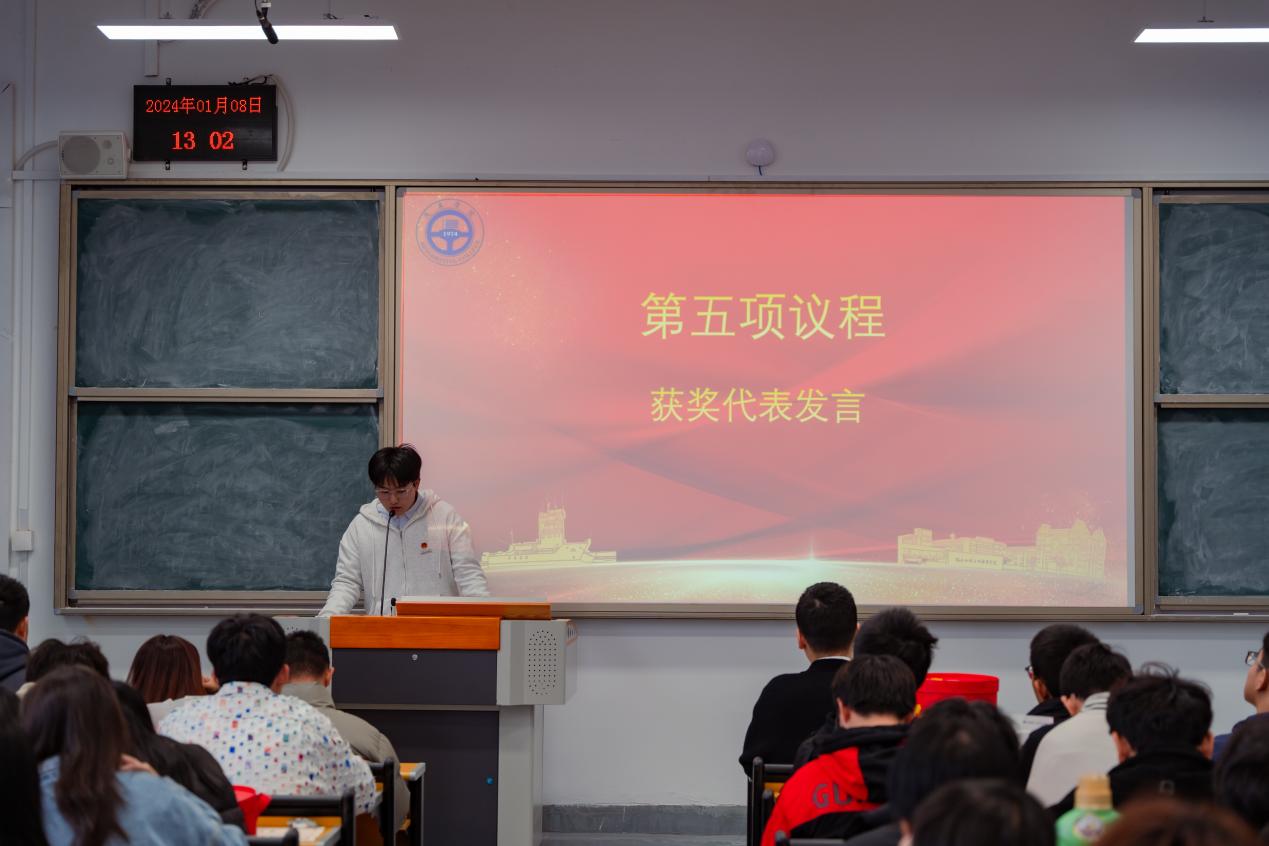 颁奖环节过后,24#205获奖宿舍学生代表李武剑同学发表感言讲话,他首先感谢学校精心搭建的活动平台,回顾了他在文明宿舍建设月中和舍友们携手共进的难忘时光,并向在场的同学分享其在改善宿舍环境、打造宿舍文化中好的经验和做法。