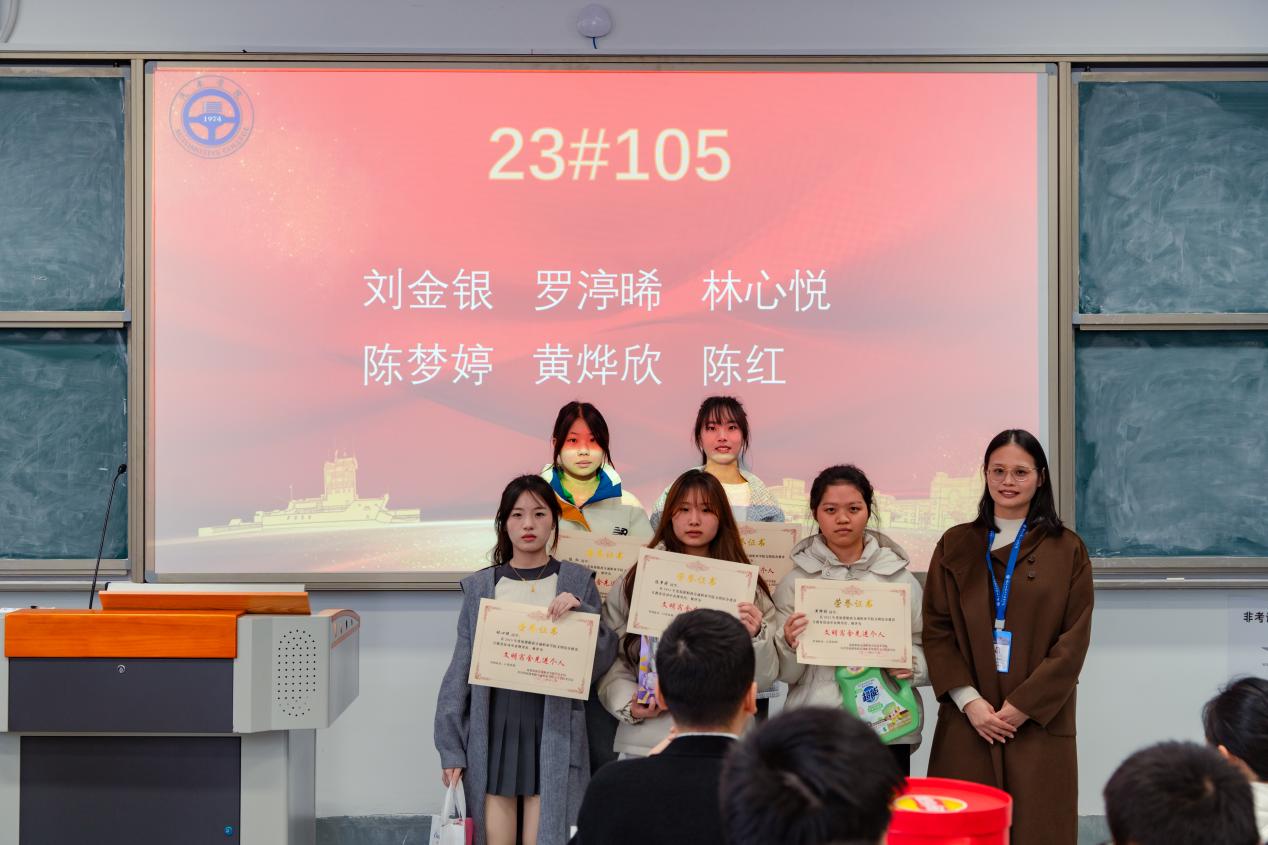 接着,由汽车学院辅导员黄唐芬、朱慧君、林思远老师分别上台,为带班宿舍获奖的同学颁发“文明宿舍先进个人”荣誉证书和精美奖品。