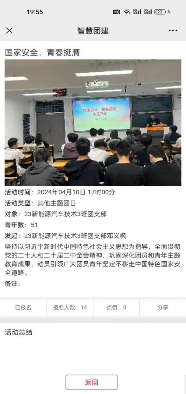 各团支部结合智慧团建系统,通过线上线下双渠道组织班级同学参与学习,以观看视频、PPT国家安全知识讲解、案例分析和同学之间互动讨论等多种形式,引导团员和青年们深入了解国家安全的基本内涵,当前面临的复杂形势以及在维护国家安全中的责任与担当。深刻体悟到维护国家安全,每个人都不是局外人,每个人都应是参与者、践行者的思想自觉,携手共筑国家防线。