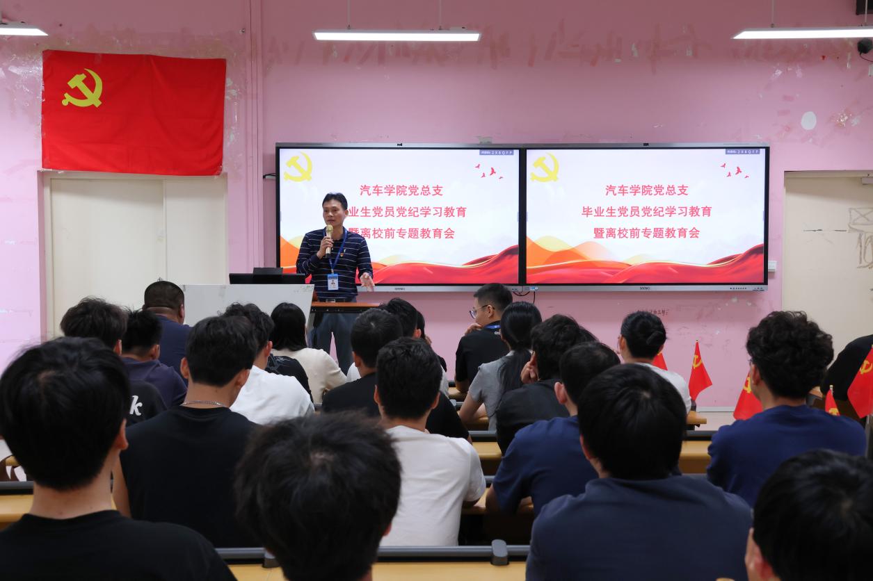 为进一步加强毕业生党员党纪教育,引导毕业生党员进一步坚定理想信念,2024年4月24日上午,汽车学院党总支在自强楼1-3教室召开2024届毕业生党员党纪学习教育暨离校专题教育会,汽车学院党总支蔡华锦书记、组织员何杰老师、第一学生党支部黄唐芬书记、团委书记、第二学生党支部书记余晨炜老师,毕业班辅导员施文、黄见山老师及汽车学院全体毕业生党员38人参加了会议。