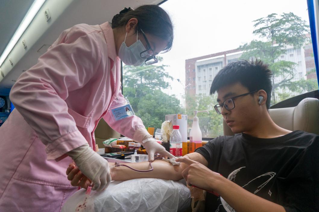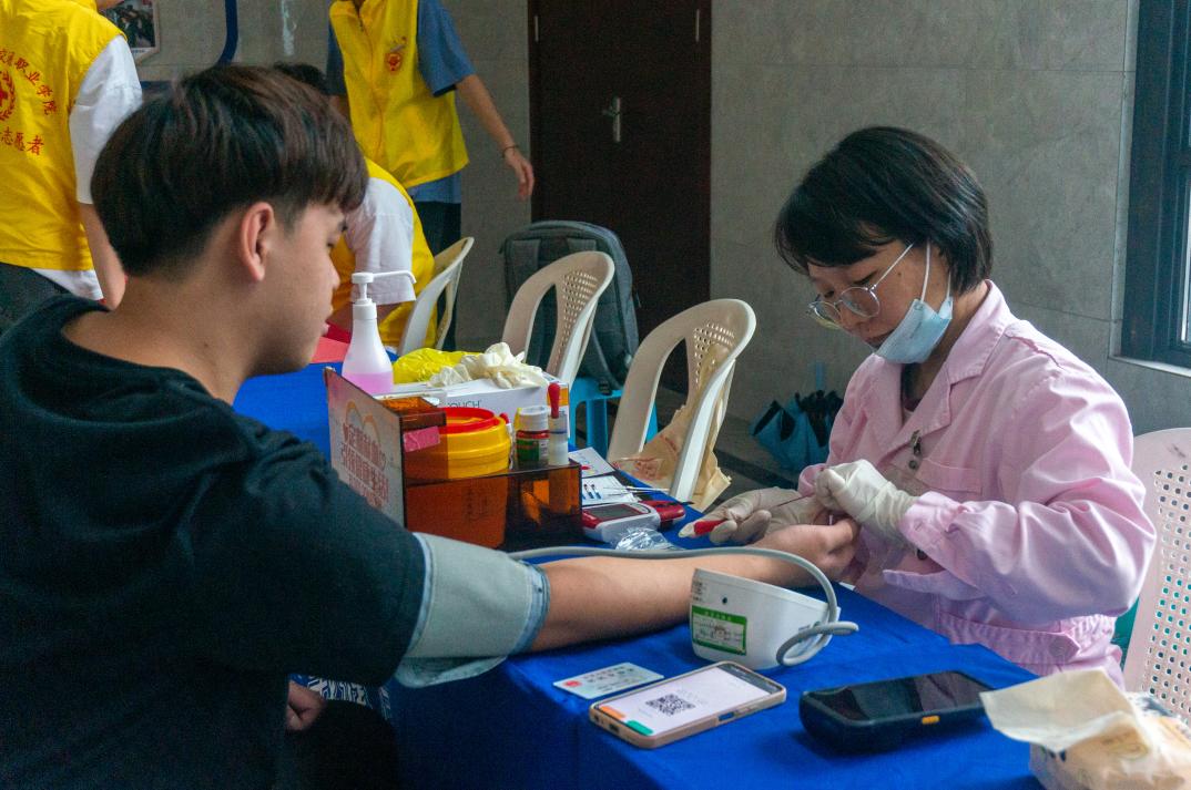 登记好了身份信息之后,为确保同学们做好了献血准备,医务人员将测量献血者血压,询问是否有贫血、高血压等不适宜献血的体征,接着采集血样,进行血型检测查看是否符合献血标准。