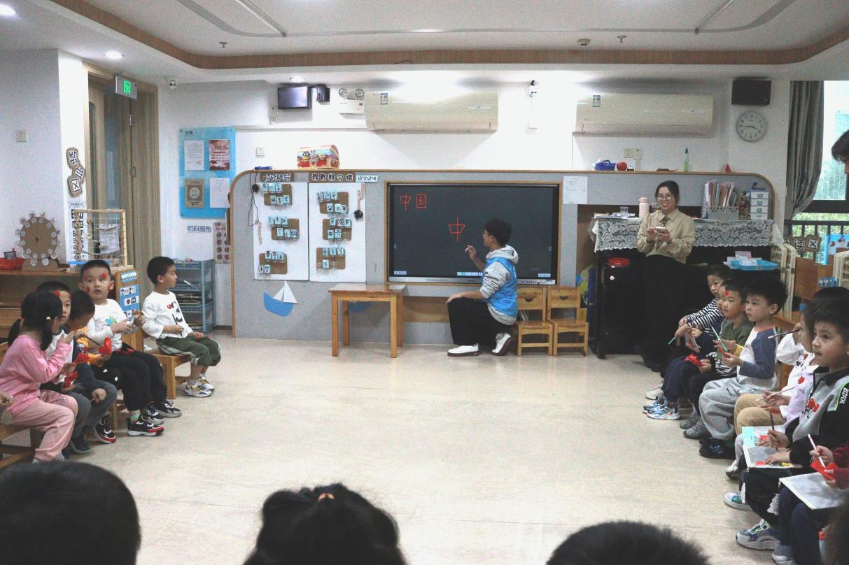 教小朋友们写“中国”二字体现了对国家认同感的启蒙,让他们从小建立对国家的认知;也是一种文化传承,开启小朋友接触中华汉字文化的大门;更彰显了爱国情怀的播种,使爱国的意识在幼小心灵中萌芽生长。