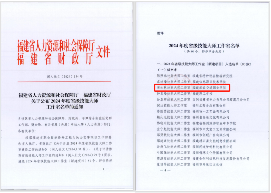 近日,福建省人力资源和社会保障厅、福建省财政厅发布《关于公布2024年度省级技能大师工作室名单的通知》,经学院组织申报、省教育厅推荐、省人社厅评审遴选,我院汽车学院实训中心主任黄知秋领办的“黄知秋技能大师工作室”入选2024年省级技能大师工作室建设项目。