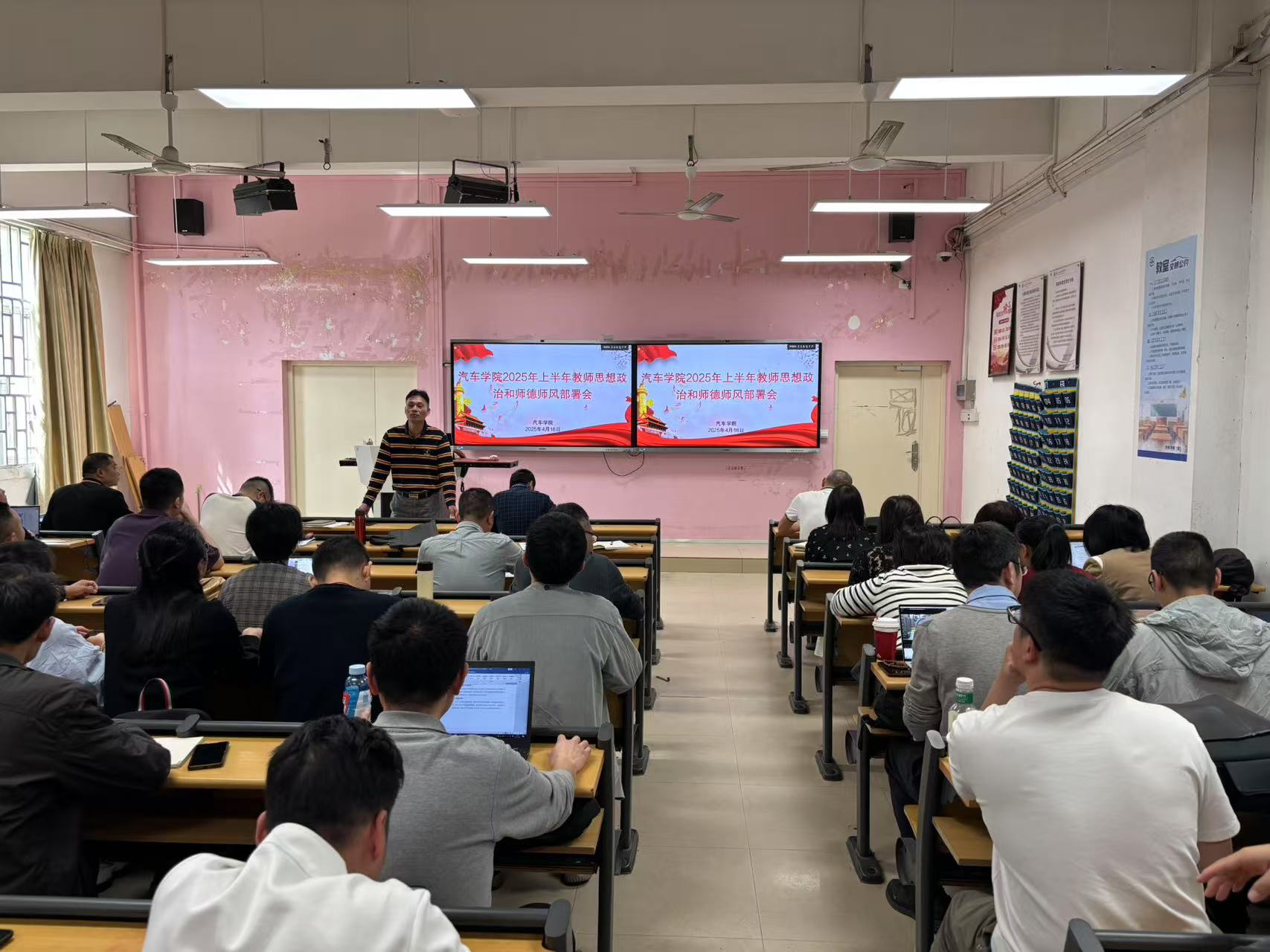 为了深入学习贯彻习近平总书记关于教育的重要论述和教师队伍建设的重要指示精神,贯彻落实学校有关工作部署,推进师德师风建设工作走深走实。4月16日,学院召开全院教师大会,对2025年上半年教师思想政治和师德师风工作做部署。会议由学院党总支书记蔡华锦主持,全体教职工参加会议。