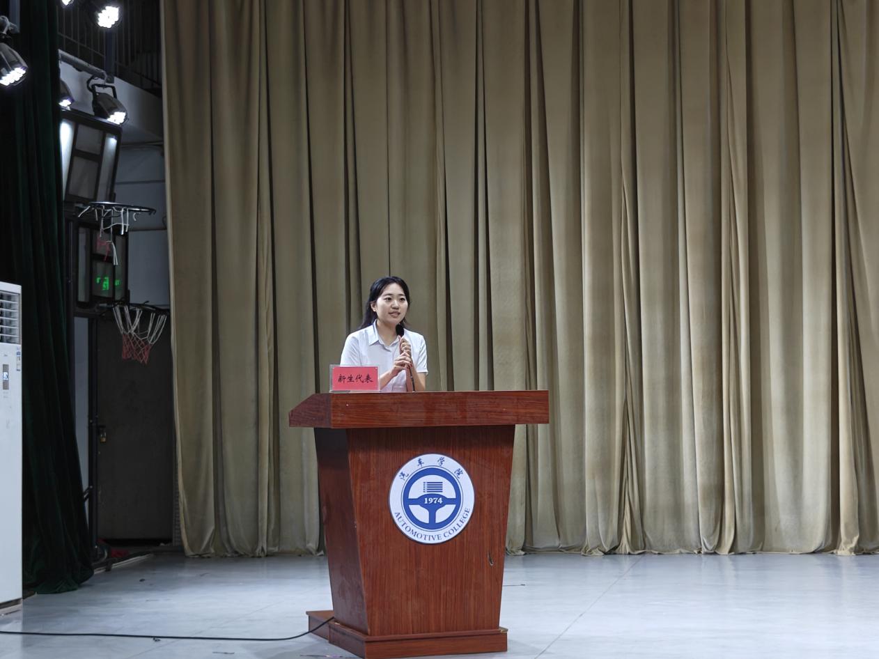 随后,新生代表孙静文发言。她满怀激动与憧憬,分享了自己对大学生活的期待,表达了与同学们共同努力、在汽车学院追逐梦想的决心,展现出新生们蓬勃的朝气与积极向上的精神风貌。