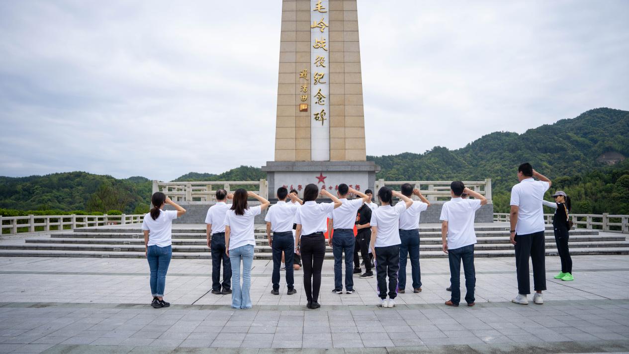 在中央苏区松毛岭战役纪念碑前,全体党员师生站立在这一片血染的红土地上庄严宣誓,铿锵有力的入党誓词在松林山间回响。