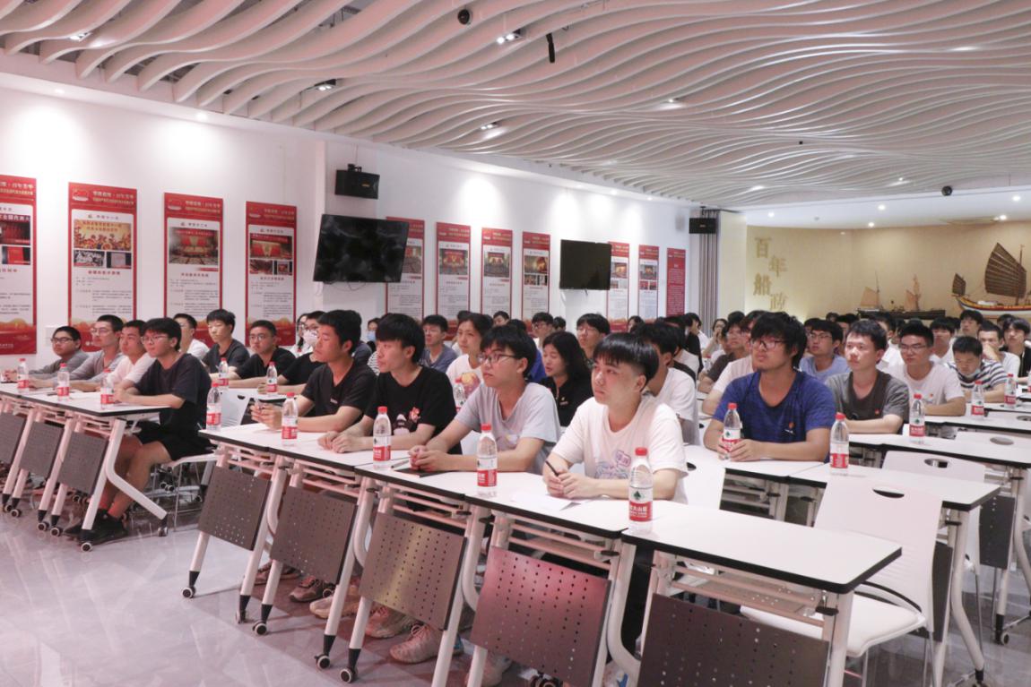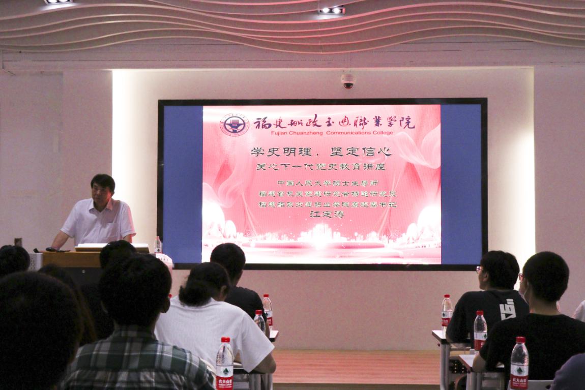 以史为鉴,开创未来。为推动党史学习教育常态化长效化开展,以实际行动迎接党的二十大胜利召开,2022年5月31日下午,学院关工委邀请“五老”代表、中国人民大学硕士生导师、福建省机关党建研究会特邀研究员、福建船政交通职业学院原党委书记江定涛做《学史明理 坚定信心》党史学习教育专题讲座。马克思主义学院教师代表、习近平新时代中国特色社会主义思想读书社、船政青年求是社、辩论协会、法学社等师生百余人参加讲座。
