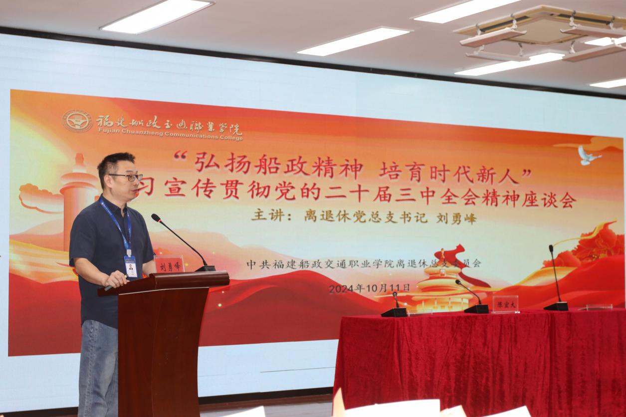 为庆祝中华人民共和国成立75周年、贯彻落实党的二十届三中全会精神,10月11日下午,离退休总支书记刘勇峰同志召开“弘扬船政精神、培育时代新人——学习宣传贯彻党的二十届三中全会精神”为主题的宣讲座谈会。全体离退休党员参会。