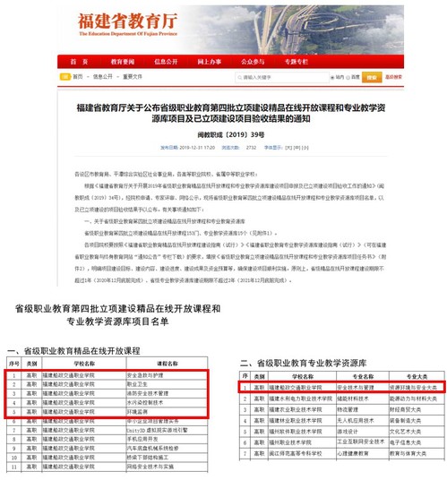 2019年12月31日,福建省教育厅公布了省级职业教育第四批立项建设精品在线开放课程和专业教学资源库项目及已立项建设项目验收结果,福建船政交通职业学院安全技术与管理专业群收获优异成绩。本次安全技术与管理专业群共获得5门省级职业精品在线开放课程立项,安全技术与管理专业获专业教学资源库立项。