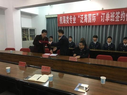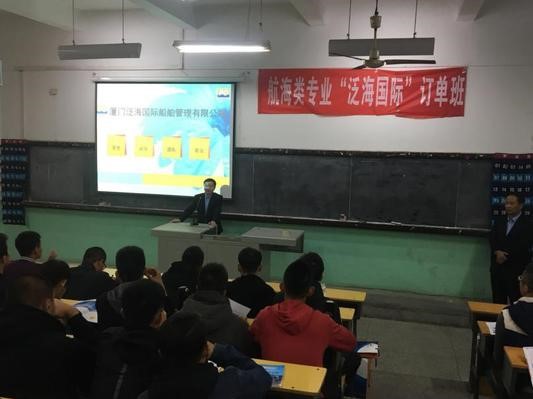 高汝武副院长首先对前来参加仪式的周经理一行表示热烈欢迎,并感谢厦门泛海国际船舶管理有限公司对我校的信任。他指出,我院航海类专业作为首批国家示范性高职院校重点建设专业,始终以培养高级应用型人才为定位,人才培养模式创新是提高教学质量的中心工作,航海类专业在精益求精,密益求密,成果导向、创新发展、持续改善供给的质量方针下,能够适应社会需求、遵循教育规律,把办学思路转到服务行业发展上来,将“产教融合、校企合作”的培养模式落实到人才培养方案中,与企业合作开办订单班,确实不是一件容易的事情,校企双方均付出了巨大的努力。同时强调航海类专业具有较强方向性和目的性,希望同学们能够把握机会、勤奋学习、锻炼技能,努力提升自身职业素养和就业竞争力,成长为优秀船长、轮机长。会议上,航海技术系江明光主任表示,将以泛海国际船舶管理公司签订订单班为契机,以校企合作为起点,充分利用好这个合作的平台,进一步了解航运业近几年以来新变化与企业对人才的需要,在企业的扶助下,提高学生学习能力,使学生深入了解企业环境,更早的找到职业归属感。