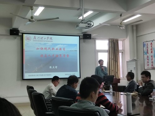 今年全国职业教育宣传周活动的主题是“技能人才展时代风采,职教奋进庆祖国华诞”。为积极响应全国职业教育宣传周的号召,营造浓厚的职业宣传氛围,提高社会各界对职业教育的认可度,进一步深化职业教育教学改革,推进现代职业教育,提高教学质量,切实加强技能型人才的培养,11月3日下午,我院邀请原厦门理工学院校长陈文哲教授作《加快现代职业教育 提高人才培养质量》专题讲座。机械学院全体教职工参会听讲,报告会由机械学院院长杨开怀博士主持。