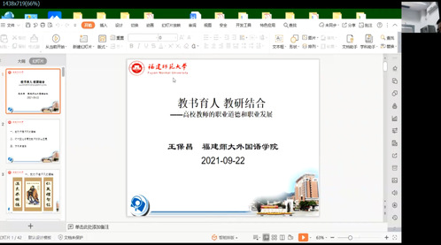 9月22日下午,福建师范大学外国语学院王保昌老师以“教书育人教研结合——高校教师的职业道德和职业发展”为题开展师德师风专题培训,分享对教师职业的理解,阐明高校教师师德师风建设的重要性,从时代变化分析高校教师职业发展中的机遇与挑战,提出发展方向、道路等工作建议,既要做到“学高为师,身正为范”,具备有高超的教育教学能力,更要有高尚的人格品质,争做“四有”好老师、当好“四个引路人”、实现“四个相统一”。最后,王老师建议,高校教师要结合教学工作开展教学研究,以教学研究带动教学工作,实现二者融合发展。