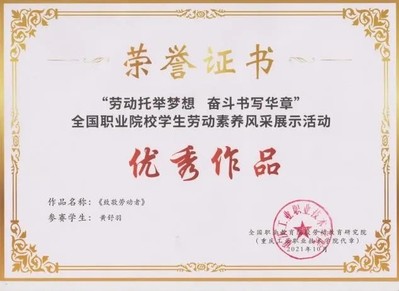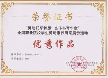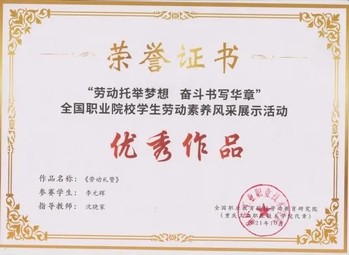 根据全国职业院校劳动教育研究院主办的第一届全国职业院校学生劳动素养风采展示活动通知要求,我院积极响应,在全院范围进行了广泛的宣传,组织开展了以“劳动最美丽奋斗最幸福”为主题的系列教育活动,动员学生踊跃参与活动。学院对评审后的优秀作品上报至全国职业院校劳动教育研究院进行参评。4个作品获奖,参赛作品充分表现了我院学子的勤俭、奋斗、创新、奉献的劳动精神。
