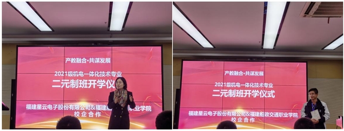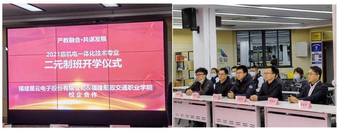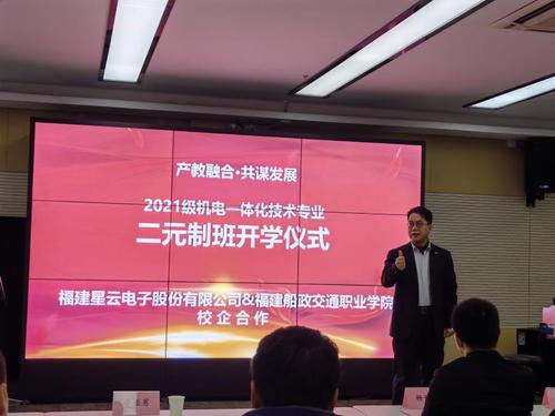 2022年1月13日,福建船政交通职业学院机械与智能制造学院2021级机电一体化技术专业“二元制”班级开学仪式在福建星云电子股份有限公司隆重举行。福建星云电子股份有限公司首席运营官黄荣发先生,人力资源总监鲁亚男女士,机械与智能制造学院杨开怀院长,王水发副院长等校企工作人员以及“二元制”班级的所有同学共同出席典礼。