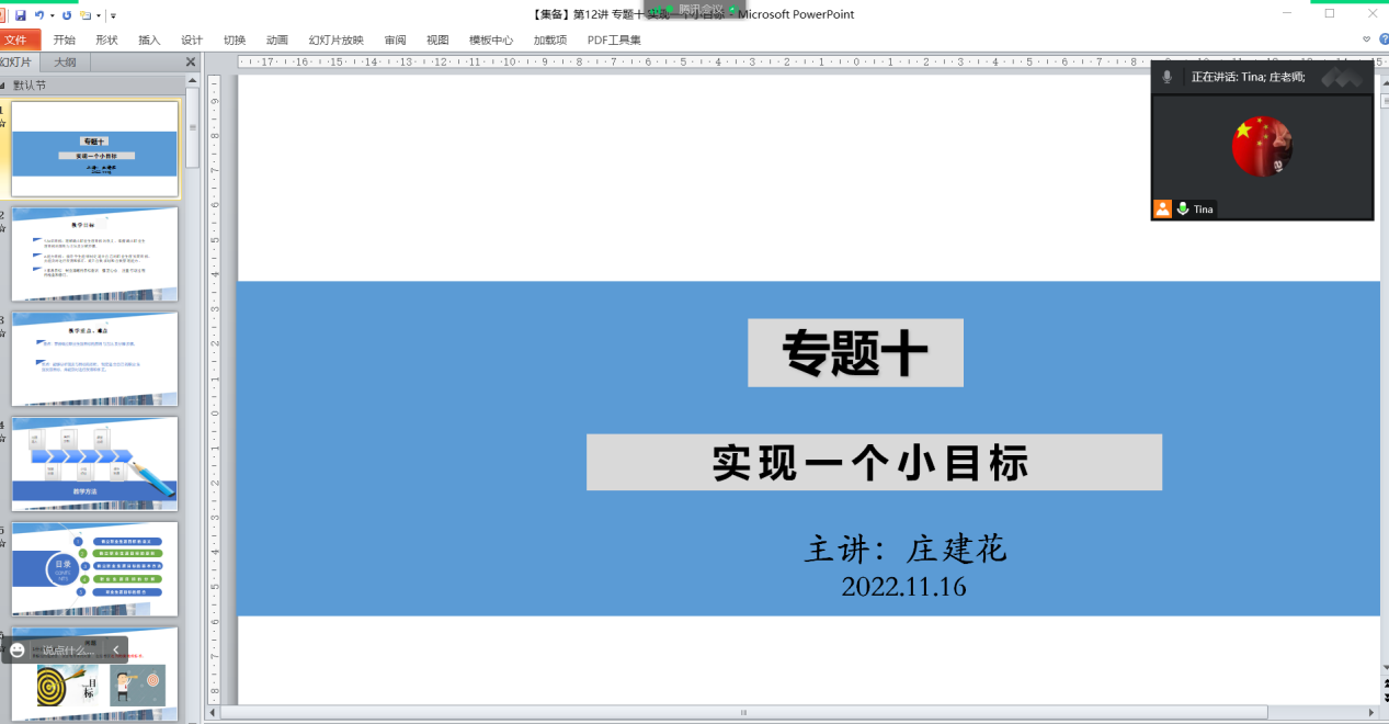 此次备课的主要内容是专题十“实现一个小目标“。首先,由庄建花老师为主讲。庄老师结合自身教学经验和当前线上教学实际,同大家详细地分享了本专题的教学设计、教学策略和授课技巧。