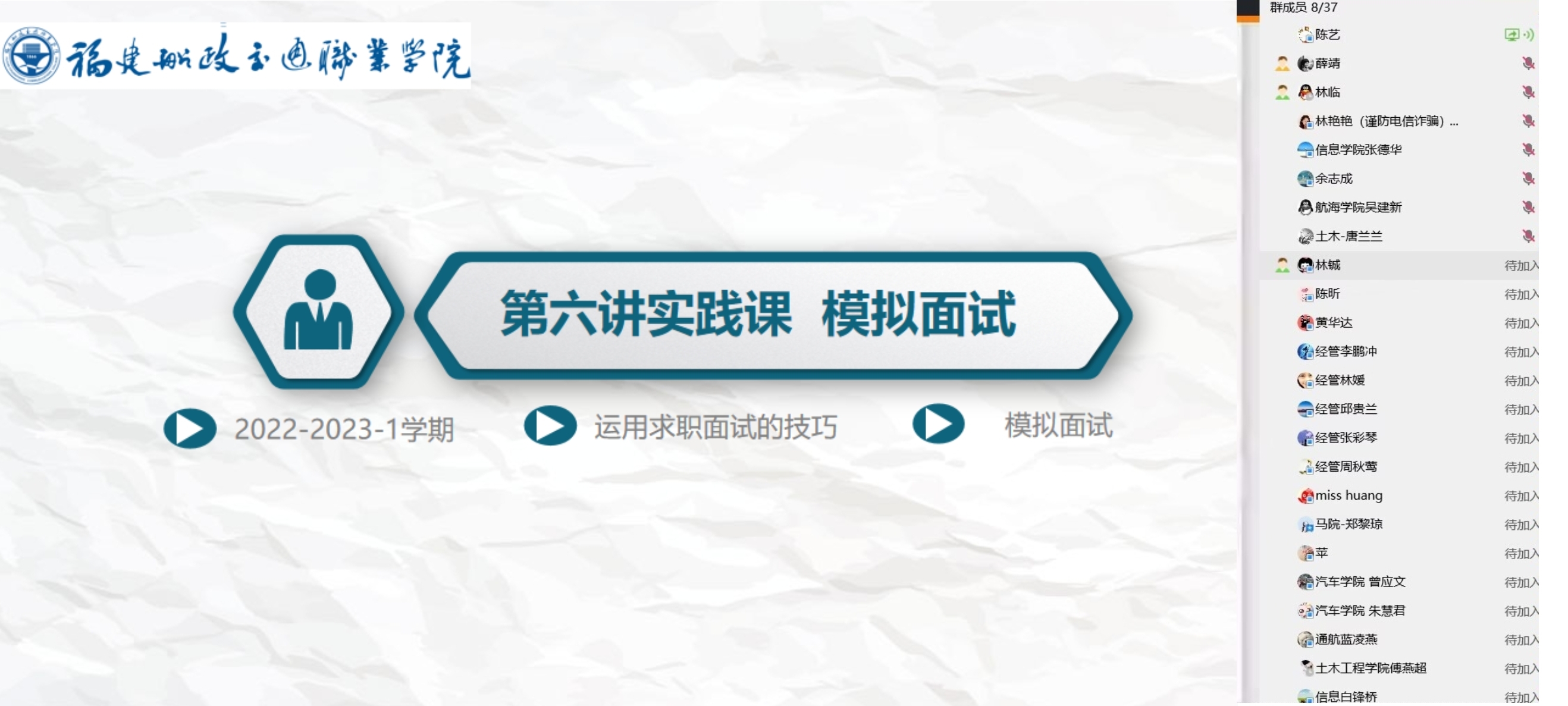 8月13日,马克思主义学院就业与创业教研室按计划举办了本学期第六次线上集体备课活动。本次活动由就业与创业教研室主任薛靖老师主持,由老师陈艺主讲,其他讲授本课的专兼职教师共同参与,本次备课主题为“第六讲 求职技巧 实践课--模拟面试”。