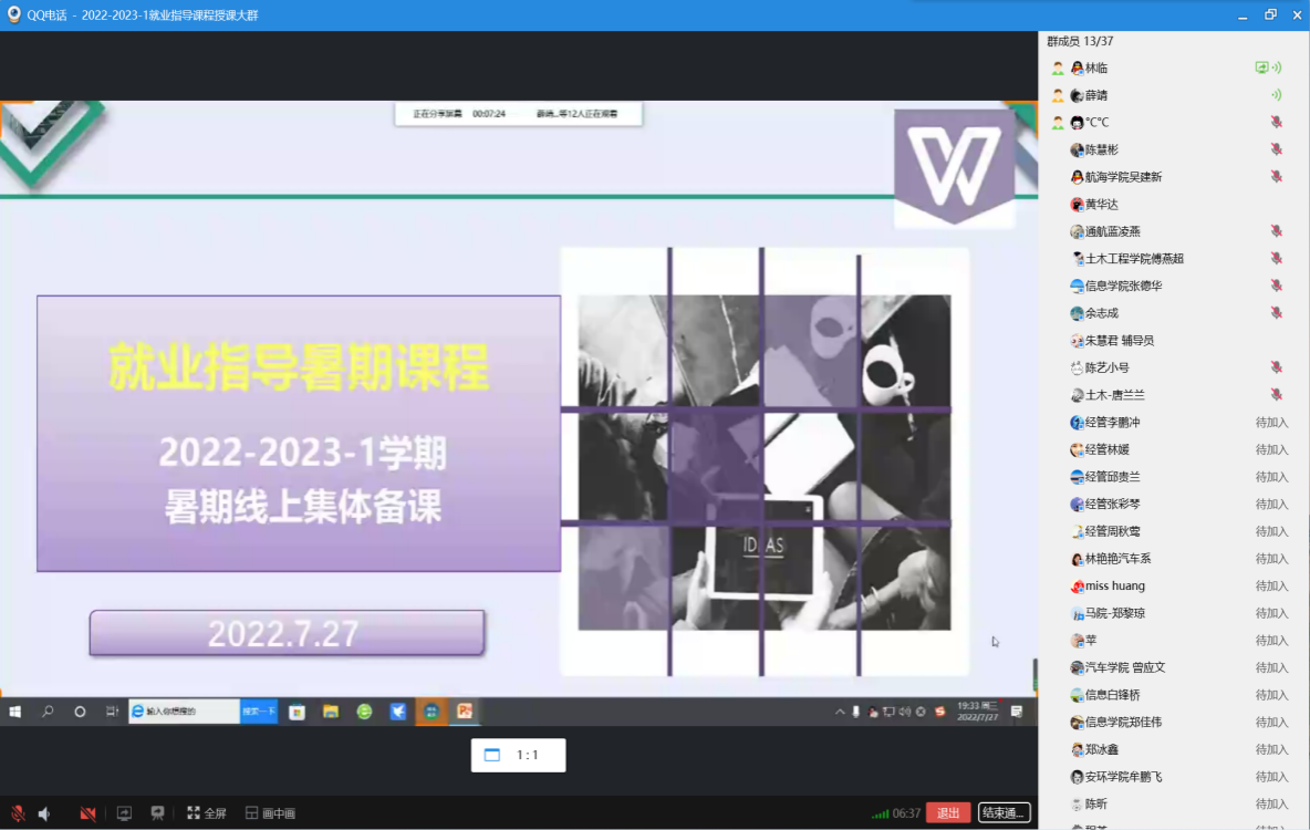 为进一步提高课程教学质量,做好毕业班就业指导工作,7月27日晚,马克思主义学院就业指导教研室主任薛靖老师组织担任2020级《就业指导》课程任课的全体专兼职教师,开展了本学期线上集体备课教研活动。