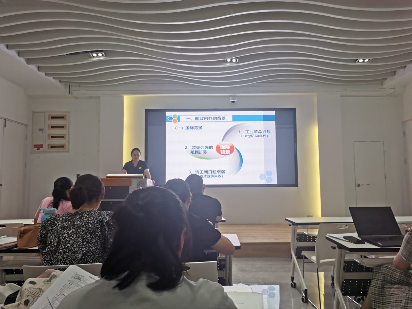 本次教研活动围绕船政文化第一模块“船政的创办及船政学堂的历史沿革”展开。陈艺老师通过对教材分析、所授学生的学情分析,对第一模块的教学目标做出了更详细的剖析,同时对教学重难点进行了教学分析与教学设计,抓住“船政精神”主线说清船政创办初期的历史背景和筹备、创办过程及历史沿革。