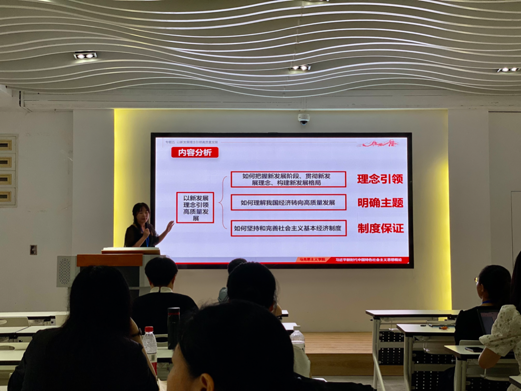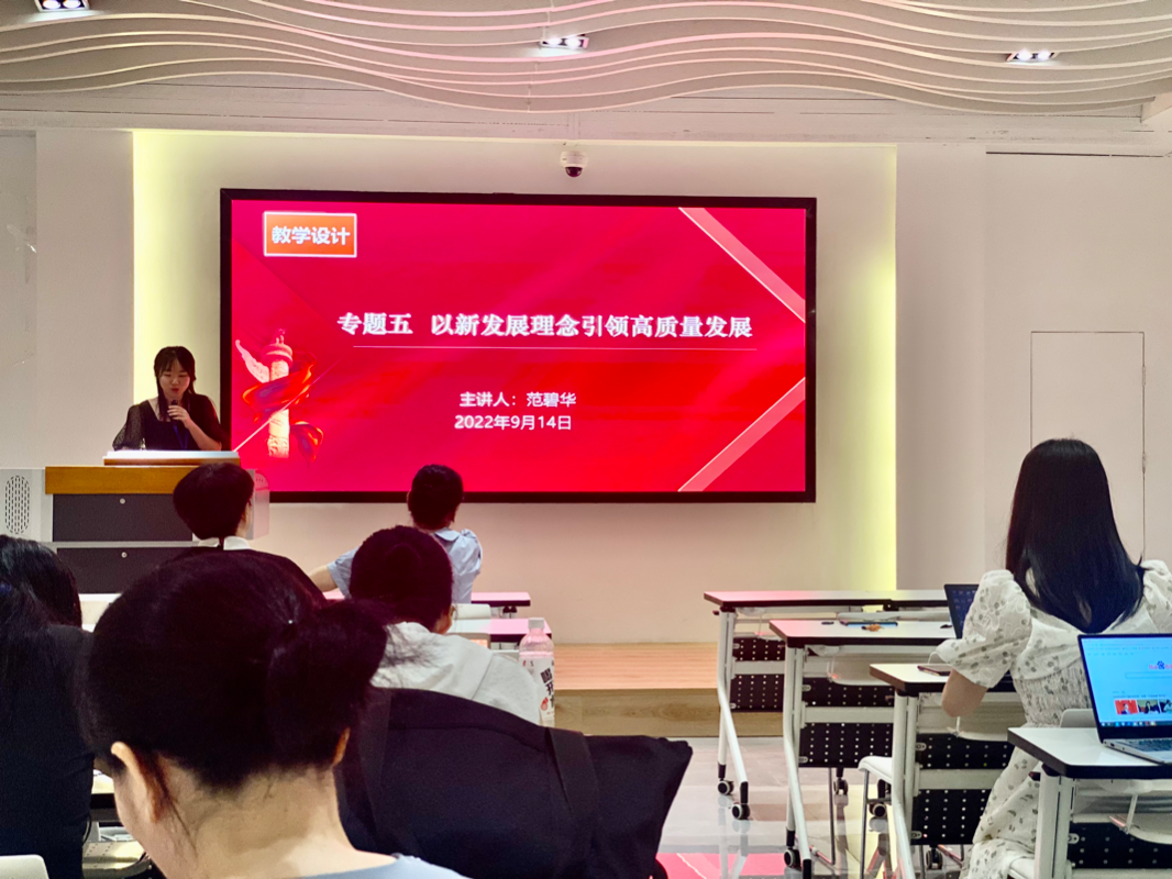 2022年9月14日,马克思主义学院“毛泽东思想和中国特色社会主义理论体系概论”教研室全体专兼职教师在图书馆三楼党建馆开展了“优·美”教学工作坊教研活动。本次教研的内容是《习近平新时代中国特色社会主义思想概论》课的专题五————以新发展理念引领高质量发展,由范碧华老师担任主讲。